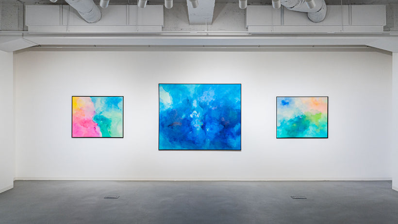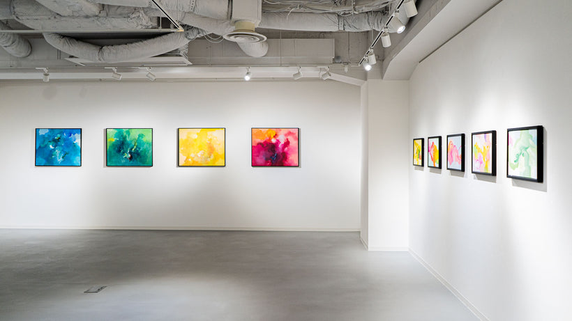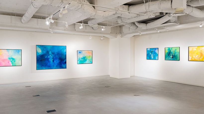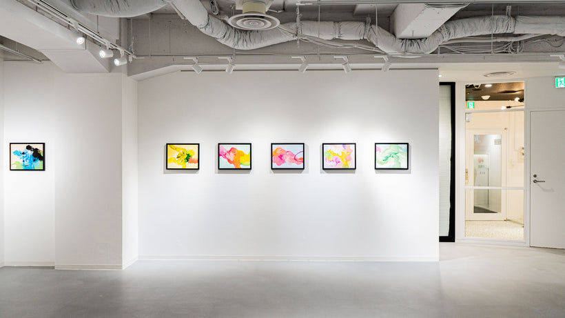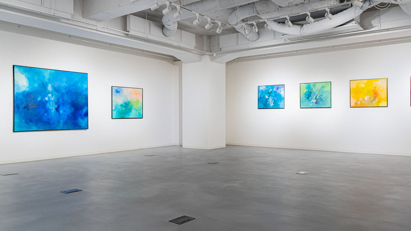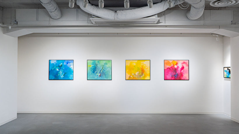 コマーシャル・イラストレーションで数多くの仕事を続けながら、焦点を定めない「ノーフォーカス」をコンセプトに抽象表現を手がけている。水彩絵具の滲み、塗り重ねたアクリル絵具。色の奥からまったく別の色が浮かび上がってくる画面には、あらゆる事象には簡単に片付けられない複雑さが潜むことが表れる。これは生きとし生けるものーそれはわかりあえない存在ーが交じり合う世界そのもの。それがゆえに焦点を定めて単純化しないことが現代のアリティとして示される。観る者は色彩が交じり合い、折り重ねられることで交じりっ気のない色が浮かび上がることを知り、共に生きる喜び、慈しみを想像する。作家自身はキャンバスに筆を下ろした瞬間から作品が完成し筆を止めるまでに湧き上がる想い、そして時間と空気感をも共感することを願って制作している。