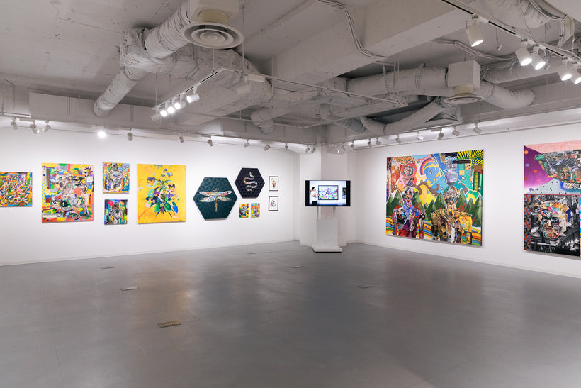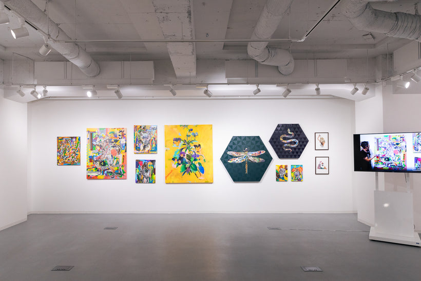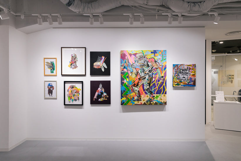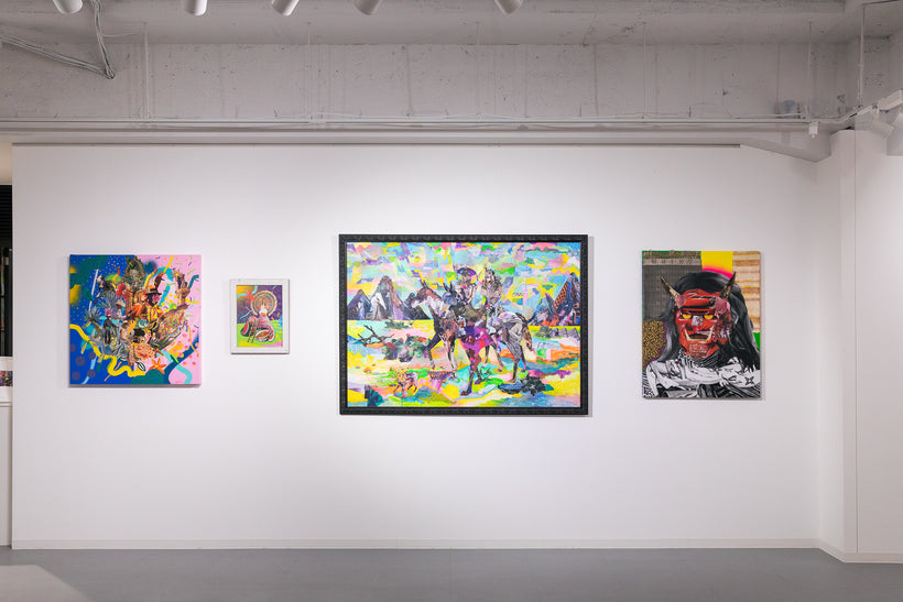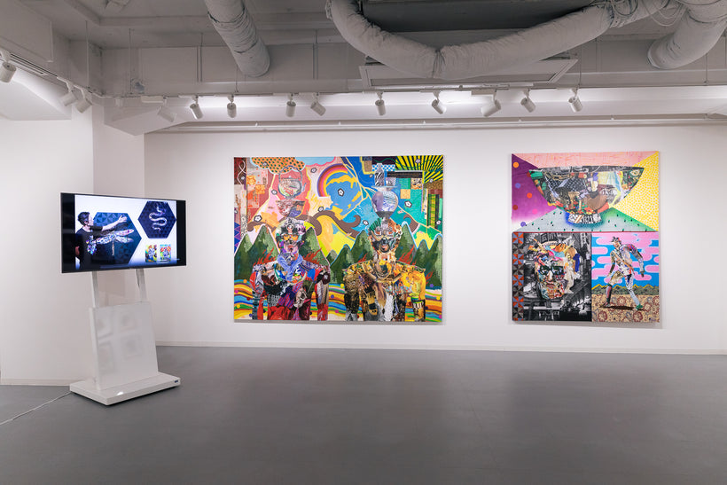 ファッション雑誌から切り出した写真と布や靴紐などの異素材をコラージュし、アクリル絵具やマーカーでペインティングを重ねて作品を制作。テーマとするのは日本人の先祖や現代人との関係性。素材はAmazonで購入し、コンビニのコピー機で出力するなど極めて日常的な方法をとっている。題材とするのが鬼や獅子舞、天狗など日本各地の郷土信仰で長らく伝えられてきた偶像たち。そこにコラージュさせるのはファッションアイコン。ここにはコロナ禍では経済を優先し世界的なイベントは強行されながら、地域に根付いた祭りや儀式が中止や延期を余儀なくされ、歴史や伝統の風化が進むことの危機感が現れている。そこから物質主義、拝金主義が蔓延し変化の激しい時代に、私たちは未来の子孫たちに一体何を残すことができるだろうか?と問いかける。