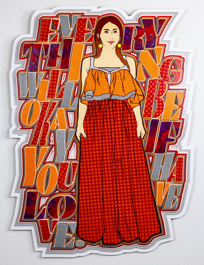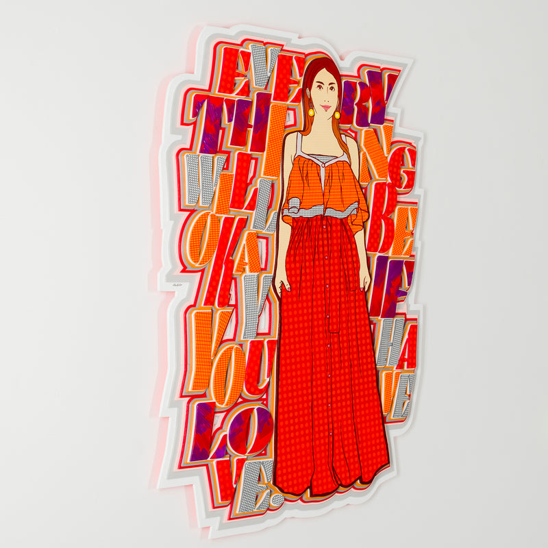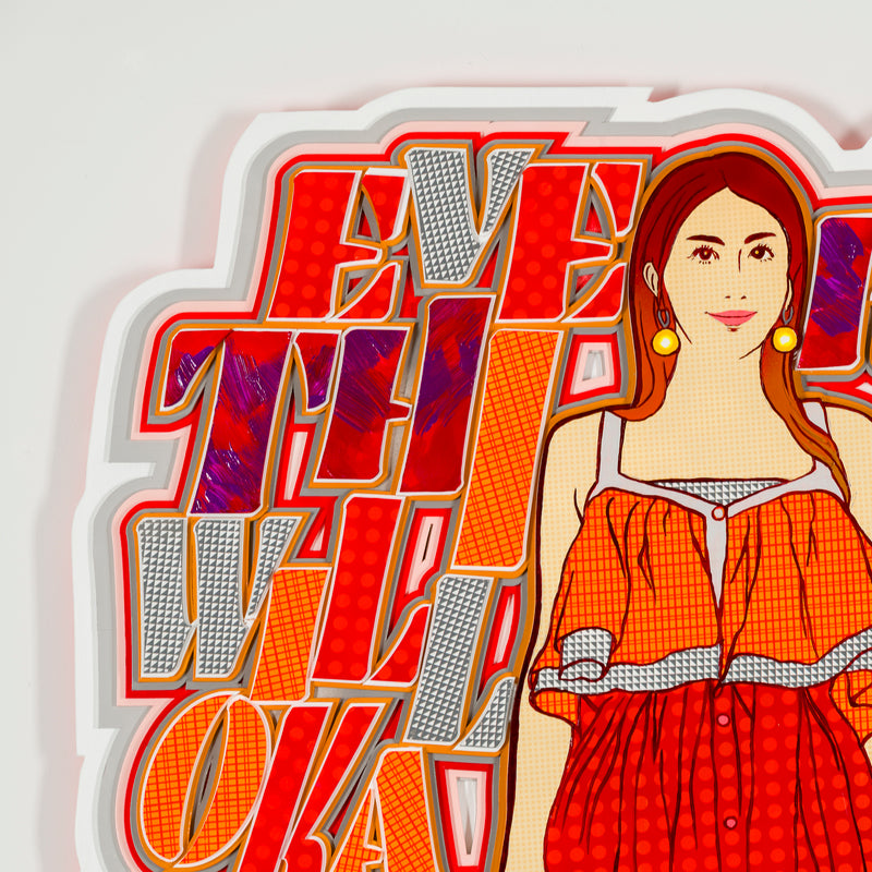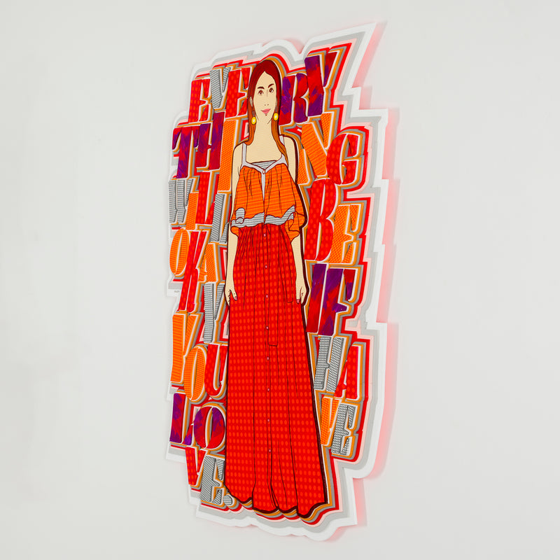 A series of semi-sculptural works based on the theme of "ideal lifestyles." The motif is a woman who easily transcends social frameworks and preconceived notions, celebrating freedom. Positive phrases are superimposed on images of women wearing their favorite fashions and enjoying the things they love, directly expressing that each of us is the protagonist of our own world.
