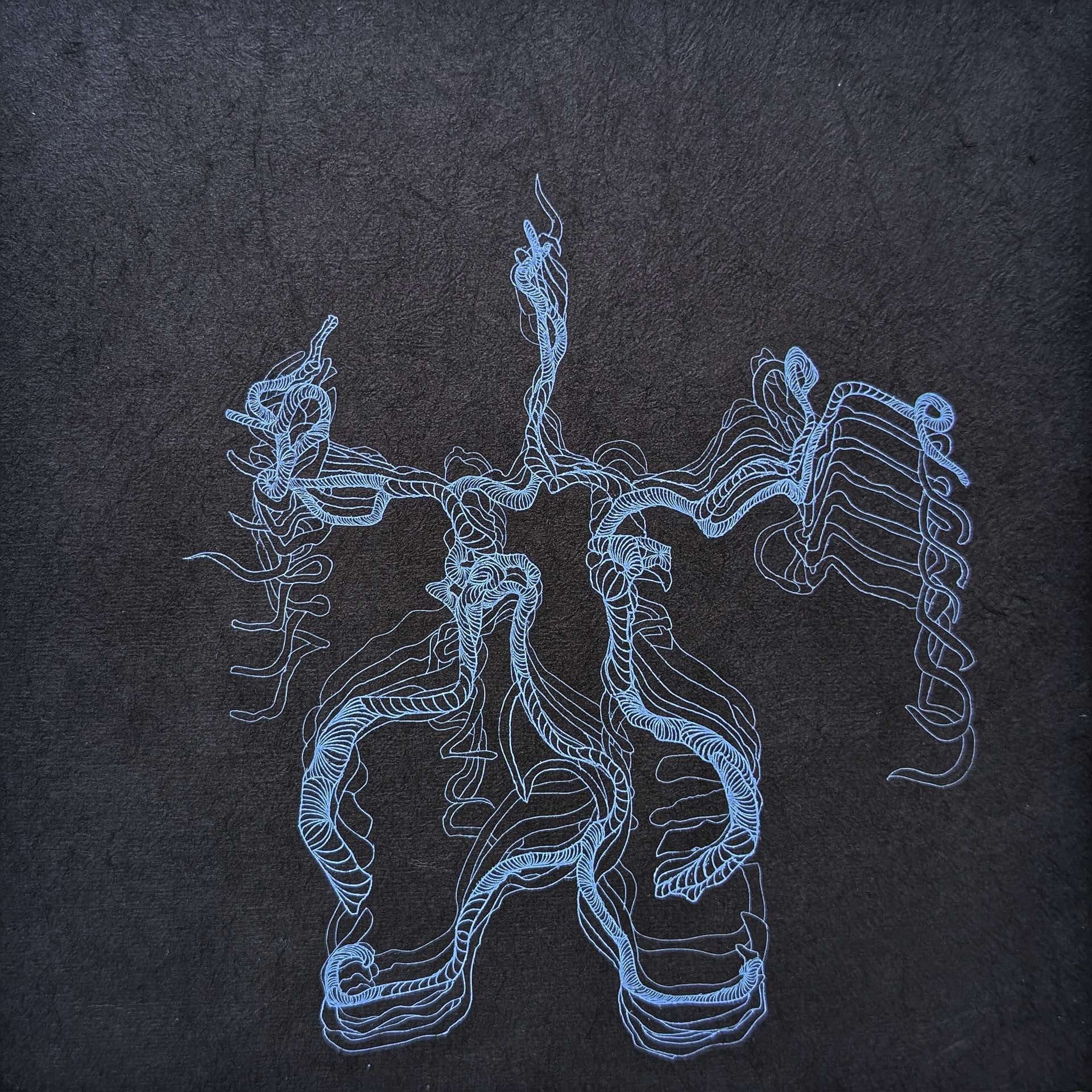 脳神経回路シリーズ《imagination Series》は重要な軸をなしています。本シリーズでは、MRIおよびMRAによって測定された自身の脳のデータを基に、神経回路や血管構造をモチーフとして版画で再構築します。