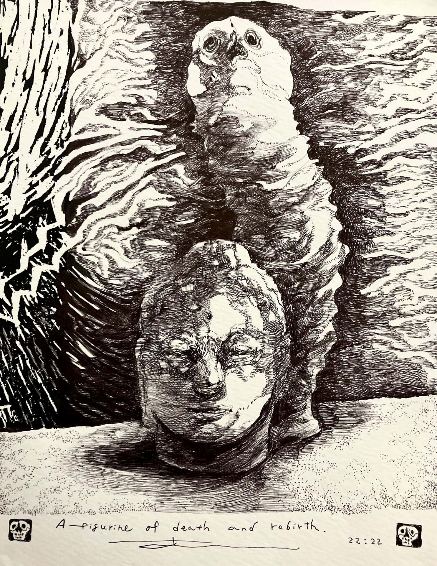 Keita Ando's work is characterized by depicting moments in which the boundary between life and death fluctuates, through images in which the body and the landscape seem to blend together. In this exhibition, "Scorching Heat and Decay / Freezing Cold and Germination," he uses fossil-like bird specimens and line drawings reminiscent of mountain ranges and blood vessels to overlap different periods of life: growth and decay, freezing and preservation. This expression brings to light a sense of "the golden mean" that is not biased toward either life or death, and by juxtaposing new works with works by contemporary artists, he presents painting as a form of expression that is constantly changing in relation to others.