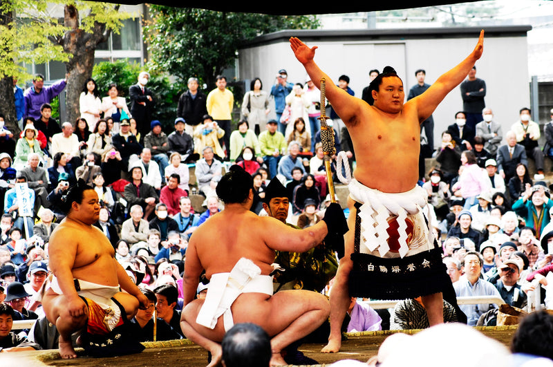 靖国神社の御霊を慰めるために始まった奉納大相撲。同神社の創建当初からある相撲場では取組のほか本場所では見られない初切り、相撲甚句、櫓太鼓打ち分けなども行われる。2008年の横綱土俵入り。披露される不知火型は、部屋の先輩である横綱吉葉山と同じ型