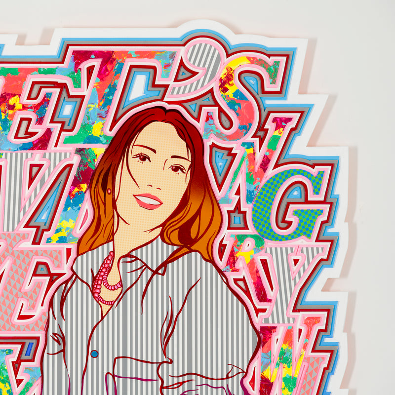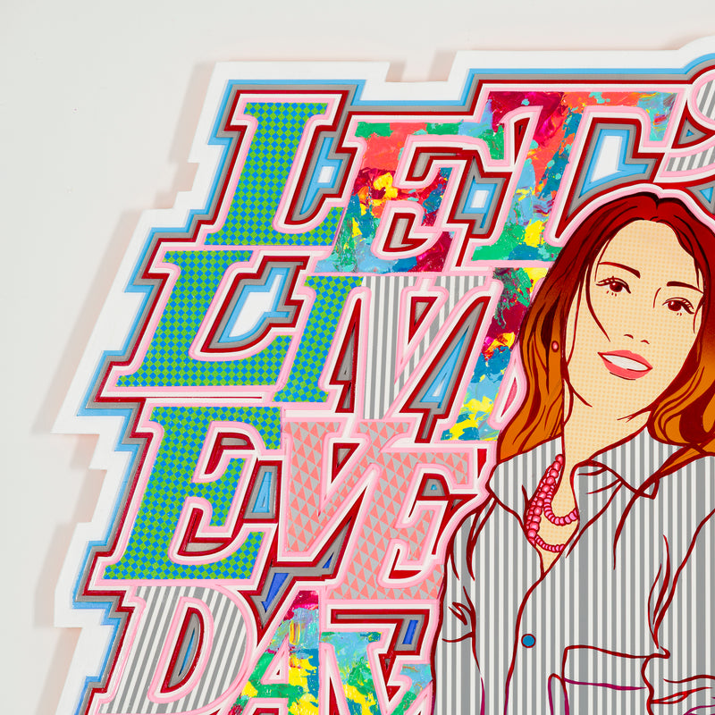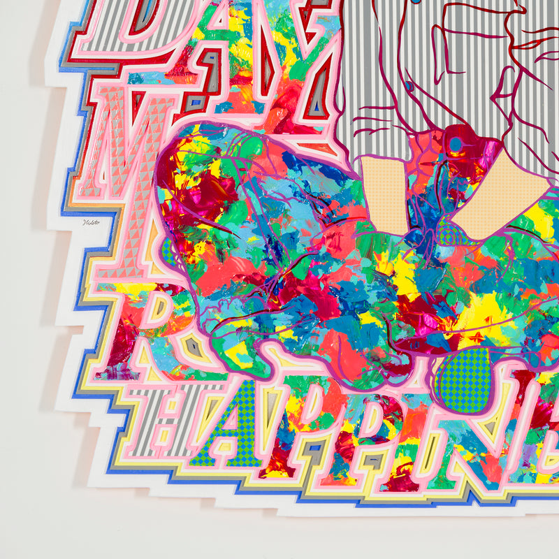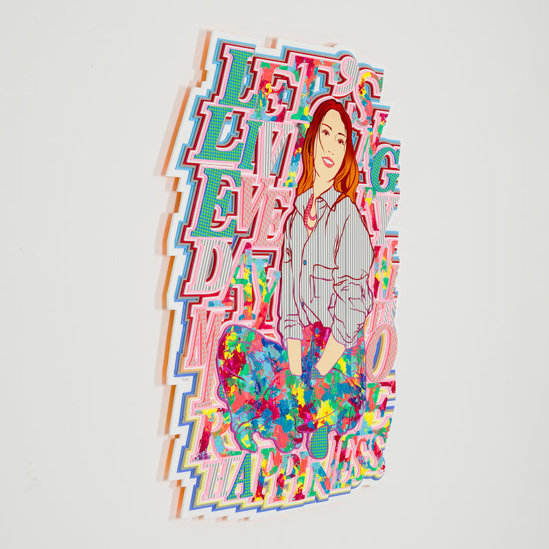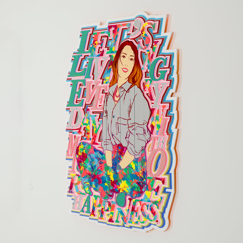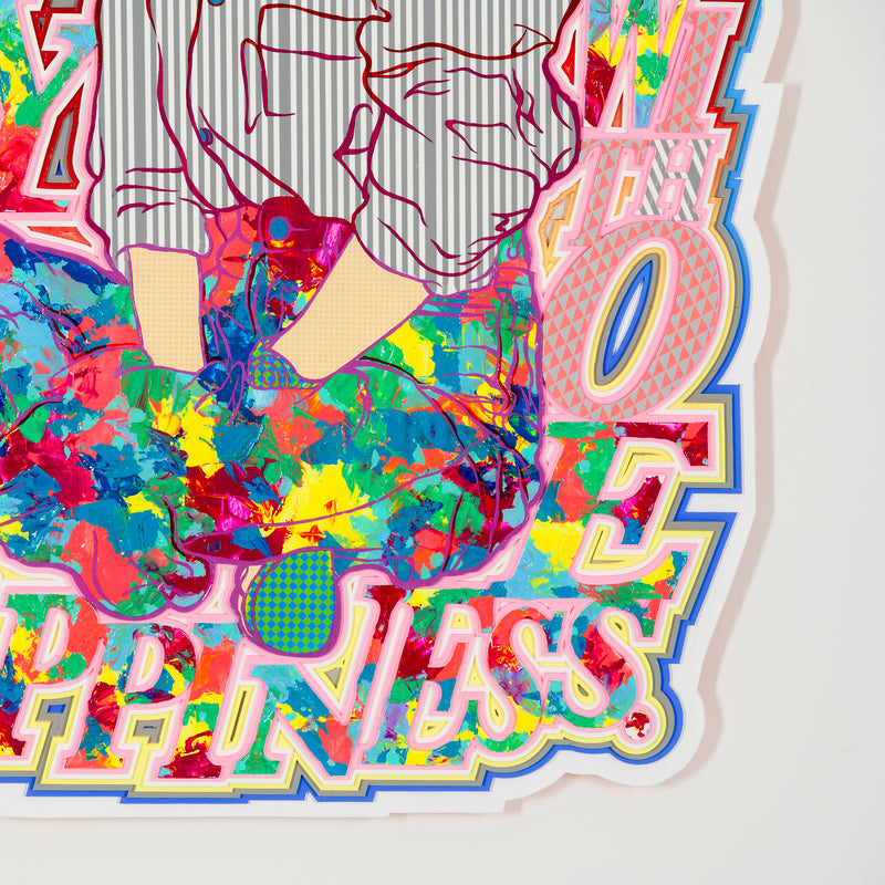 ビビッドな視覚効果が、言葉とイメージを観る者へダイレクトに届ける。レイヤーごとに描き込まれた鮮やかな色柄と、緻密に構成された要素の積層が示すのは、絵空事の理想郷ではない。日々考え、手を動かすことでこそ実現できる、“現実としてのユートピア”を提示する。