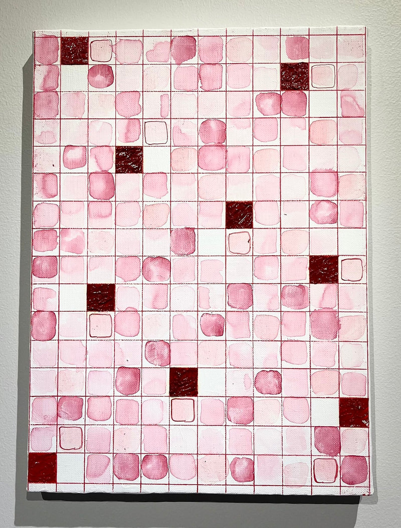 単色の画面には複数の光のイメージが重ねられている。赤は闇を照らす炎を、余白は朝の光を象徴し、異なる光の反復が「光の集積」という主題を形づくる。光は作家にとって希望の象徴である。