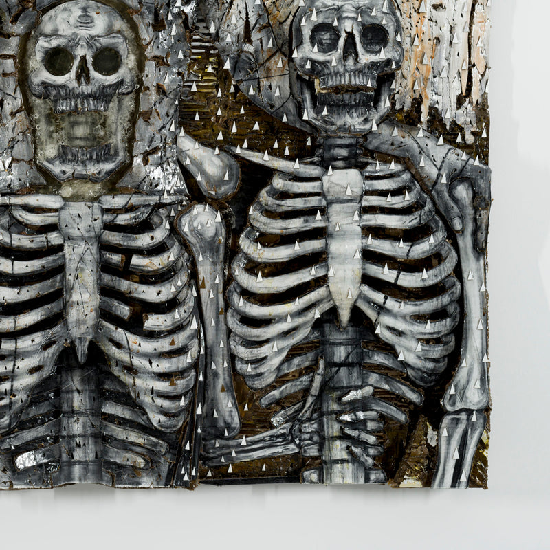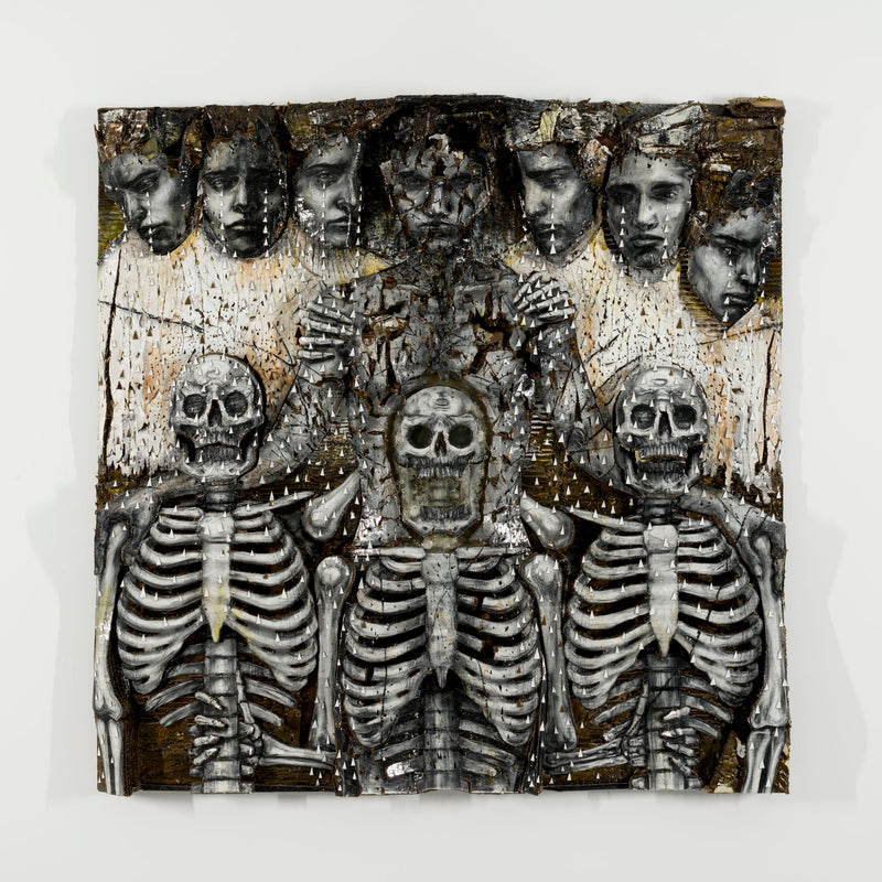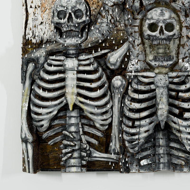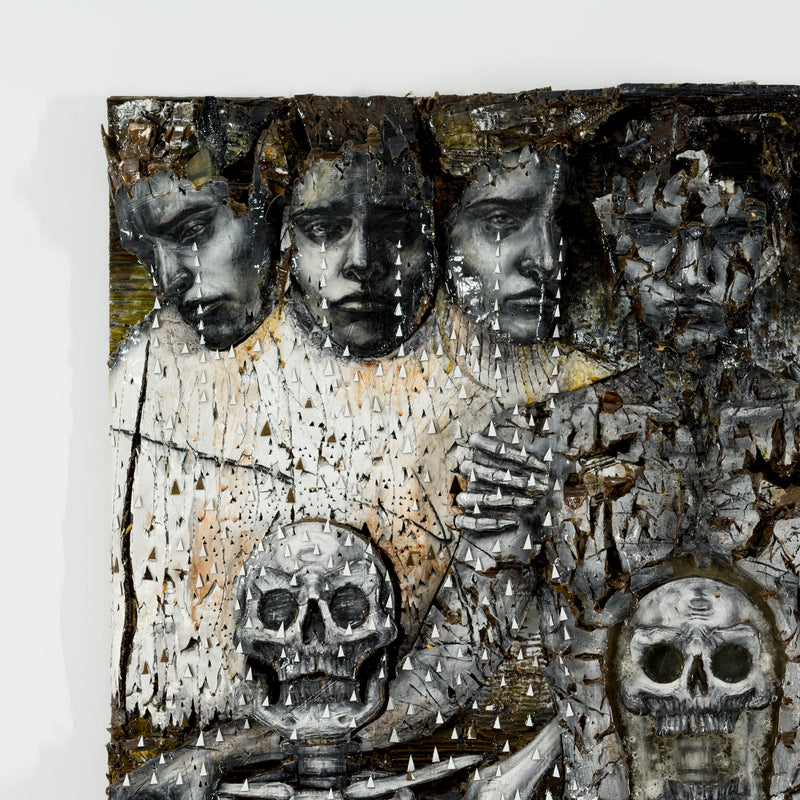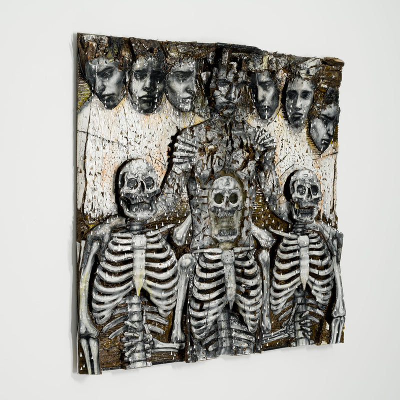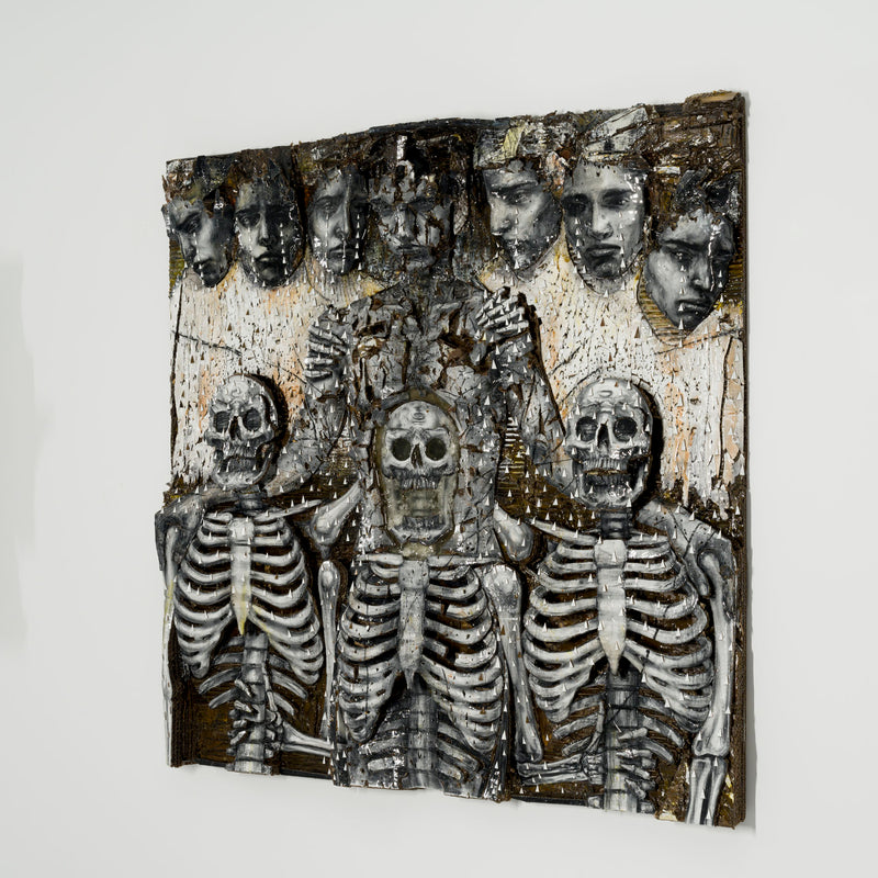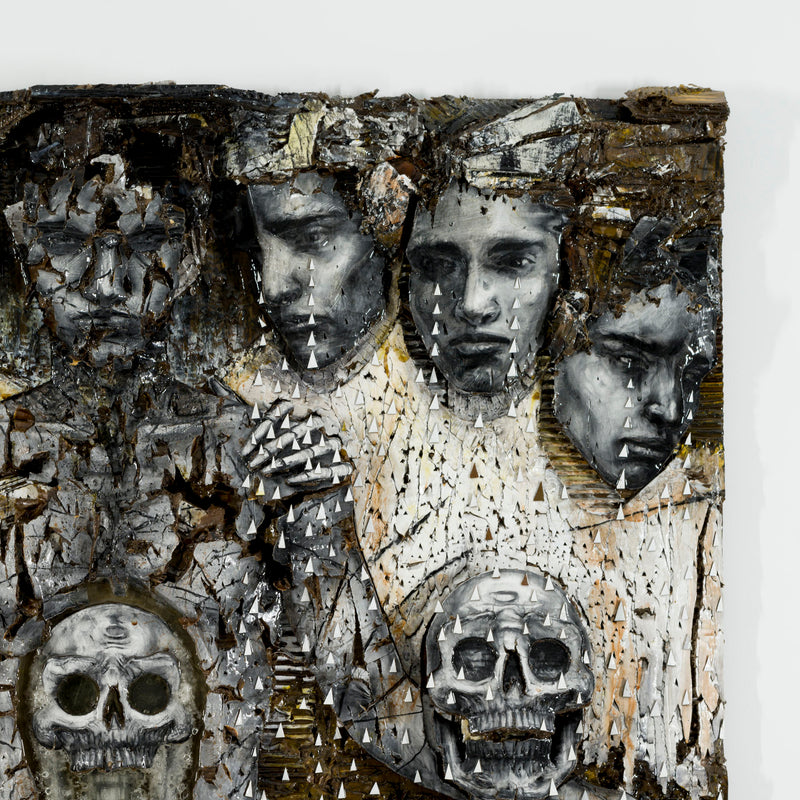 積層ダンボールに絵を完成させ、ナイフで絵を傷つけ、半立体に再構築、樹脂で硬化、という4 工程で、誕生、死、再生、永遠を表現する「RESIN 死と再生」シリーズの作品。描き、壊し、再生する制作工程を繰り返す事は、一度死んだ魂を再生する為の通過儀礼として、生きる為に必要な行為とされ、制作工程において魂への救済が得られ、輝く再生に転化する。