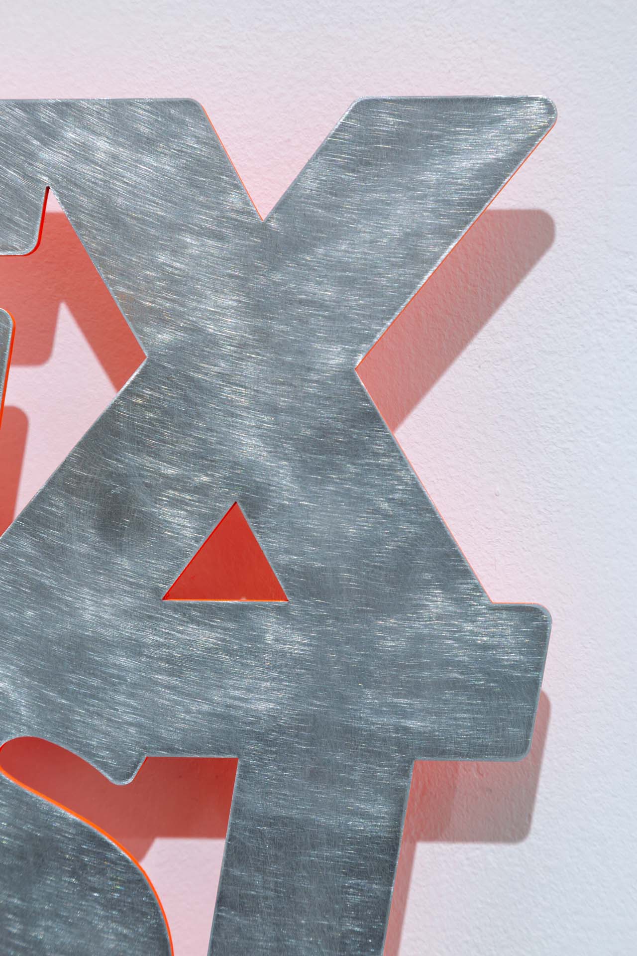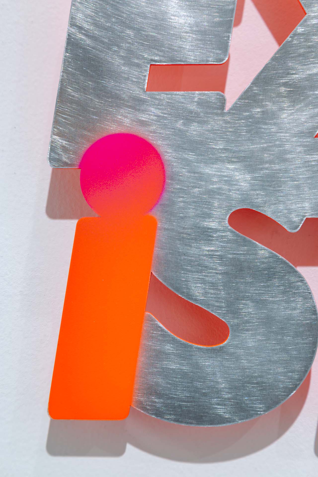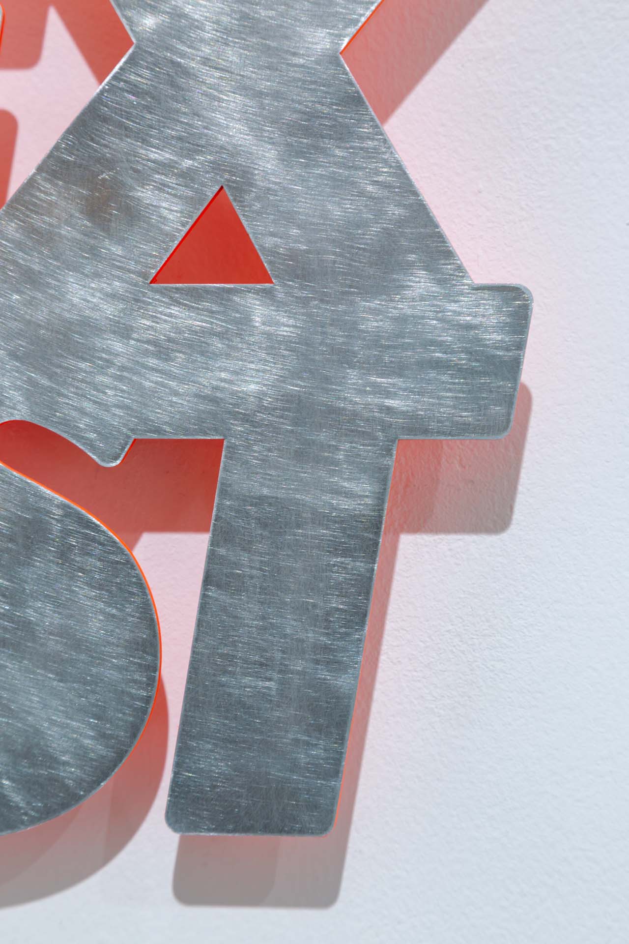 本展では、デモのプラカードや社会の声から着想を得ながら、文字そのものを立体化し、言葉を“読むもの”から“掲げるもの”へと再構築している。アルミやアクリルが生む光や影、形の存在感が、短い言葉に込められた思いや願いをより強く際立たせる。北山は、誰もが知るシンプルな言葉に人の感情や現実の重みを重ね、私たちが社会とどう向き合うのかを静かに問いかけている。