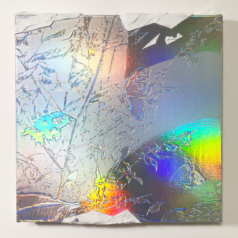 ホログラム素材に透明な絵の具を重ねる独自技法による作品。見る角度によって表情が変化し、光の屈折によって特定の色に限定されない多層的な輝きを放ちながら虹色の光が浮かび上がる。鑑賞者の視点によって像が変容する構造は、現実の多面性を可視化し、固定された見方を超えて変化し続ける可能性を提示している。