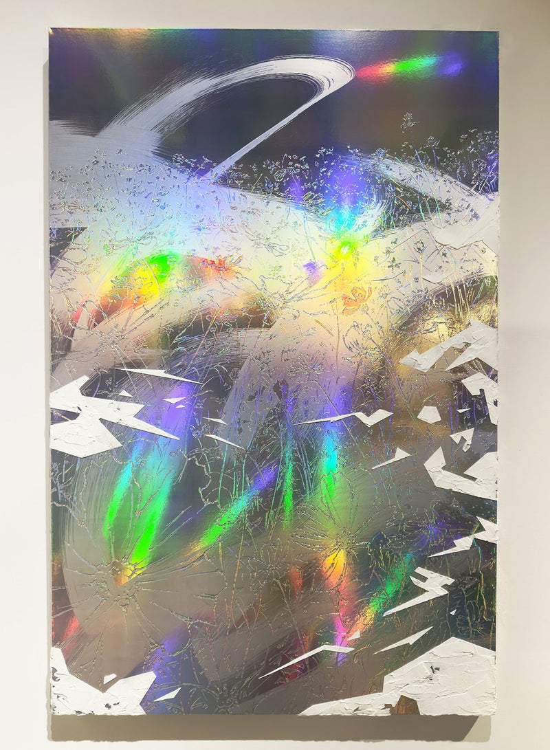 ホログラム素材に透明な絵の具を重ねる独自技法による作品。見る角度によって表情が変化し、光の屈折によって特定の色に限定されない多層的な輝きを放ちながら虹色の光が浮かび上がる。鑑賞者の視点によって像が変容する構造は、現実の多面性を可視化し、固定された見方を超えて変化し続ける可能性を提示している。