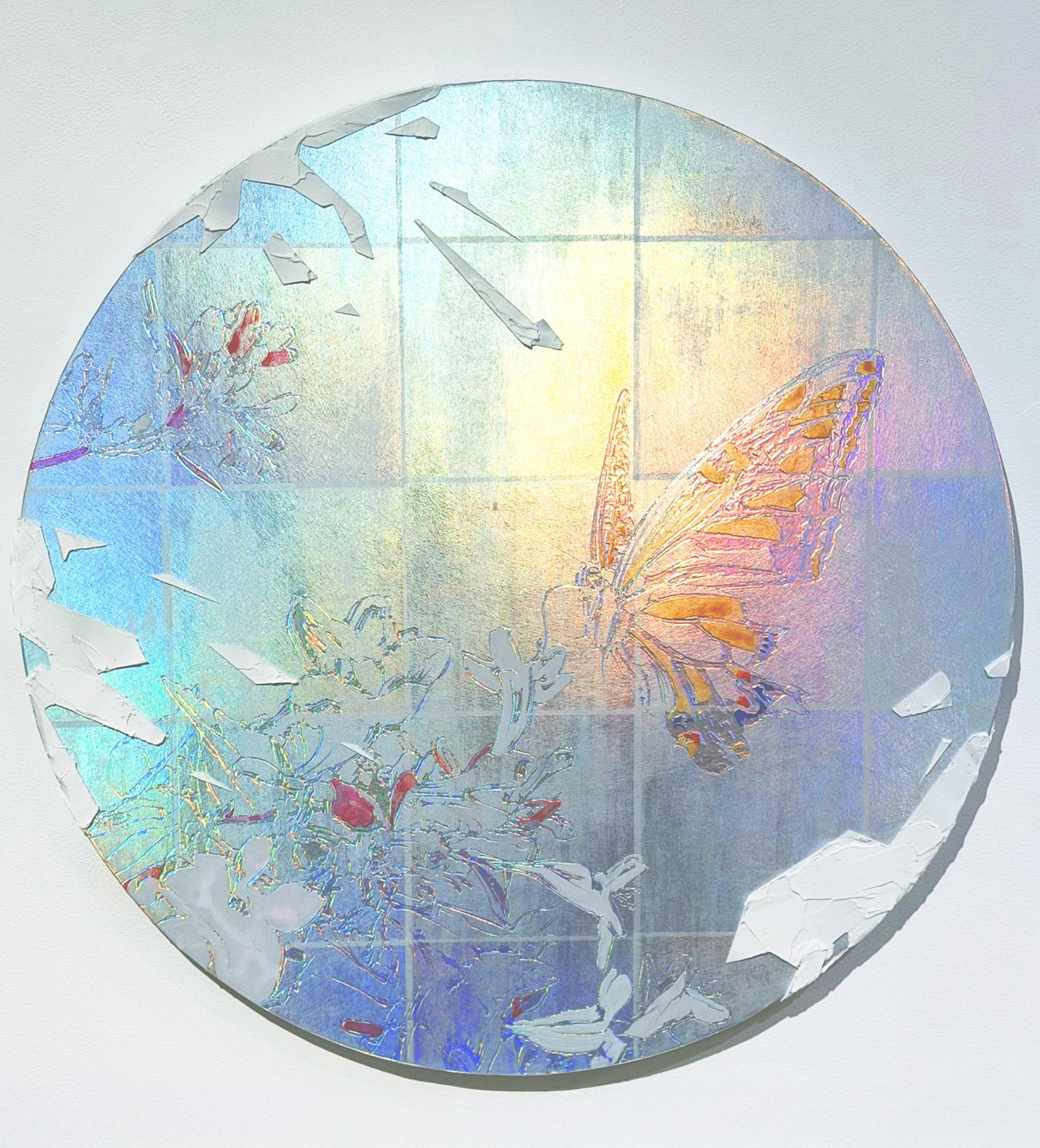 ホログラム素材に透明な絵の具を重ねる独自技法による作品。見る角度によって表情が変化し、光の屈折によって特定の色に限定されない多層的な輝きを放ちながら虹色の光が浮かび上がる。鑑賞者の視点によって像が変容する構造は、現実の多面性を可視化し、固定された見方を超えて変化し続ける可能性を提示している。