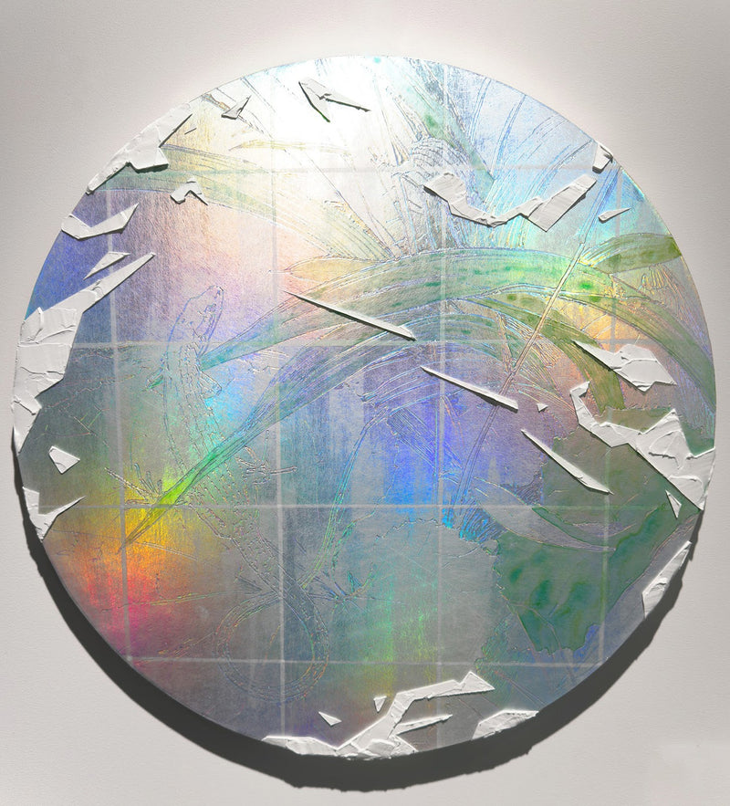 ホログラム素材に透明な絵の具を重ねる独自技法による作品。見る角度によって表情が変化し、光の屈折によって特定の色に限定されない多層的な輝きを放ちながら虹色の光が浮かび上がる。鑑賞者の視点によって像が変容する構造は、現実の多面性を可視化し、固定された見方を超えて変化し続ける可能性を提示している。