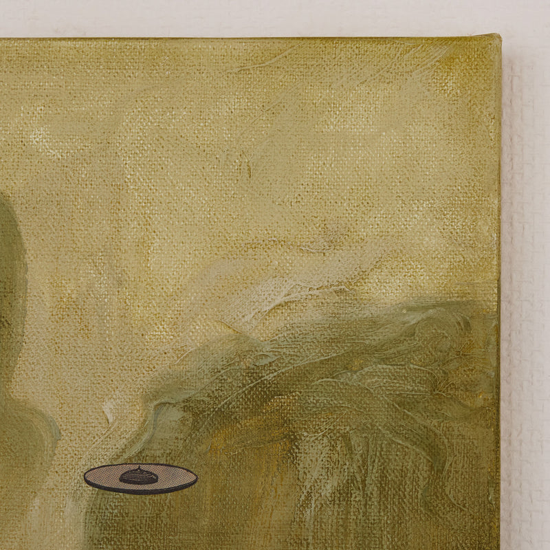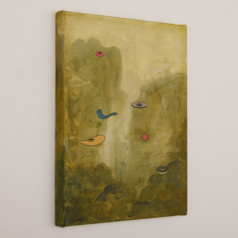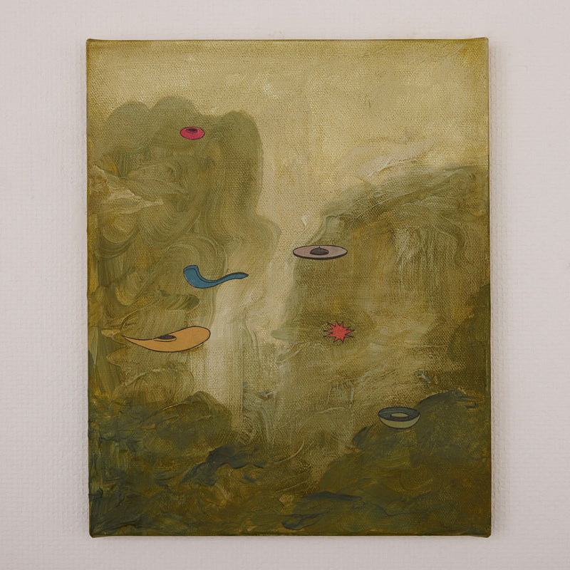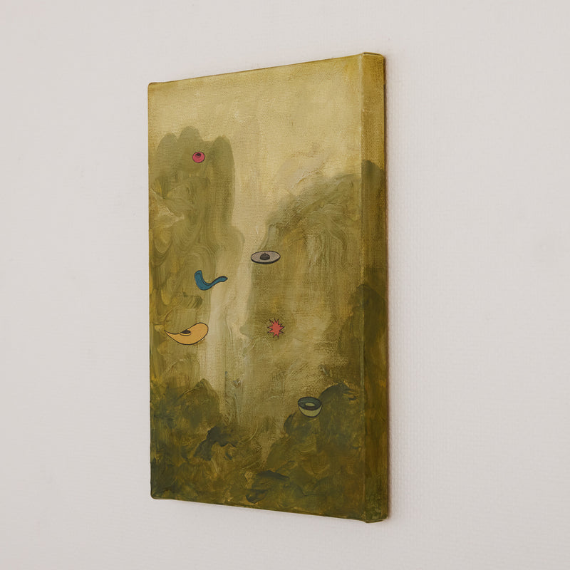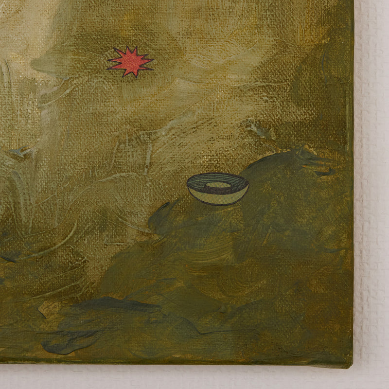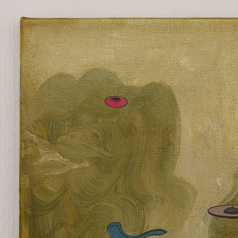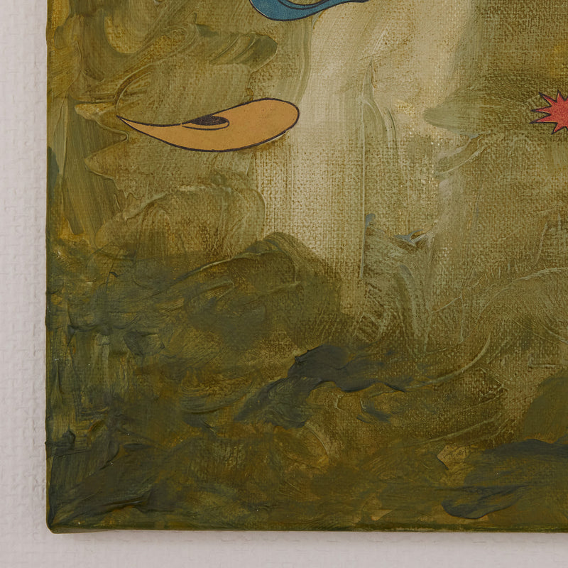 異国の友人から届いた手紙のような感触。そこに描かれるのはシュールな世界。ひとコマ漫画のような具象作品やコラージュによる抽象絵画を描いている秋元。作風を固定するのではなく具象と抽象の間に漂うものを描くことに関心があると話します。テーマに囚われることなく色、形、そしてアクリル絵具など画材のテクスチャーに集中し描いたペインティングとコラージュ作品で構成する「抽象と具象と社長」展示作品。