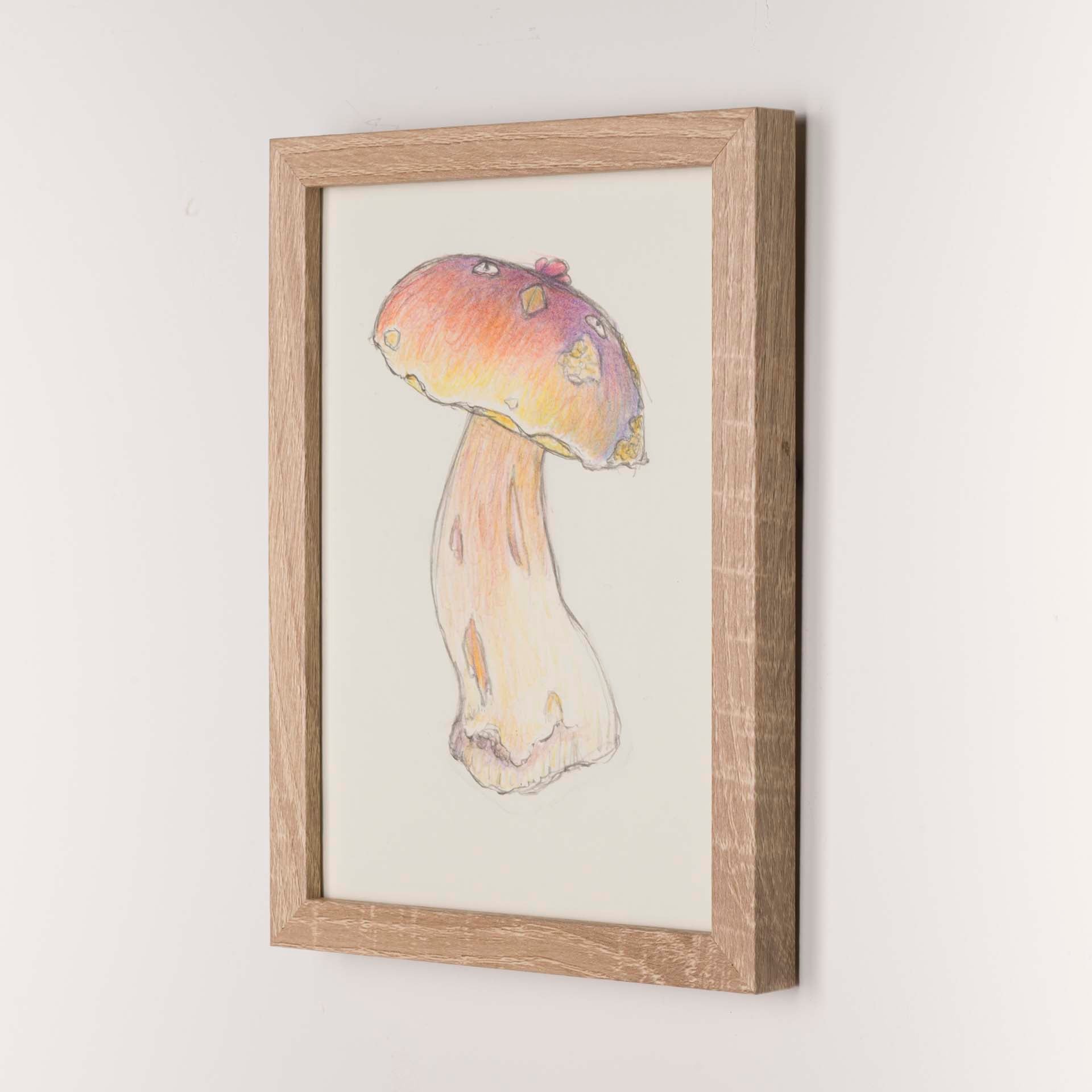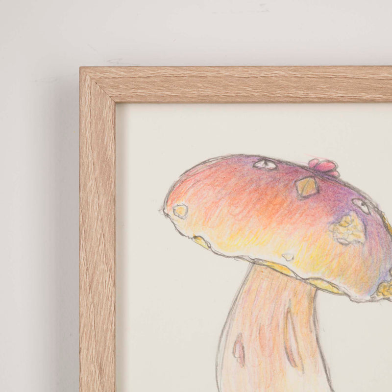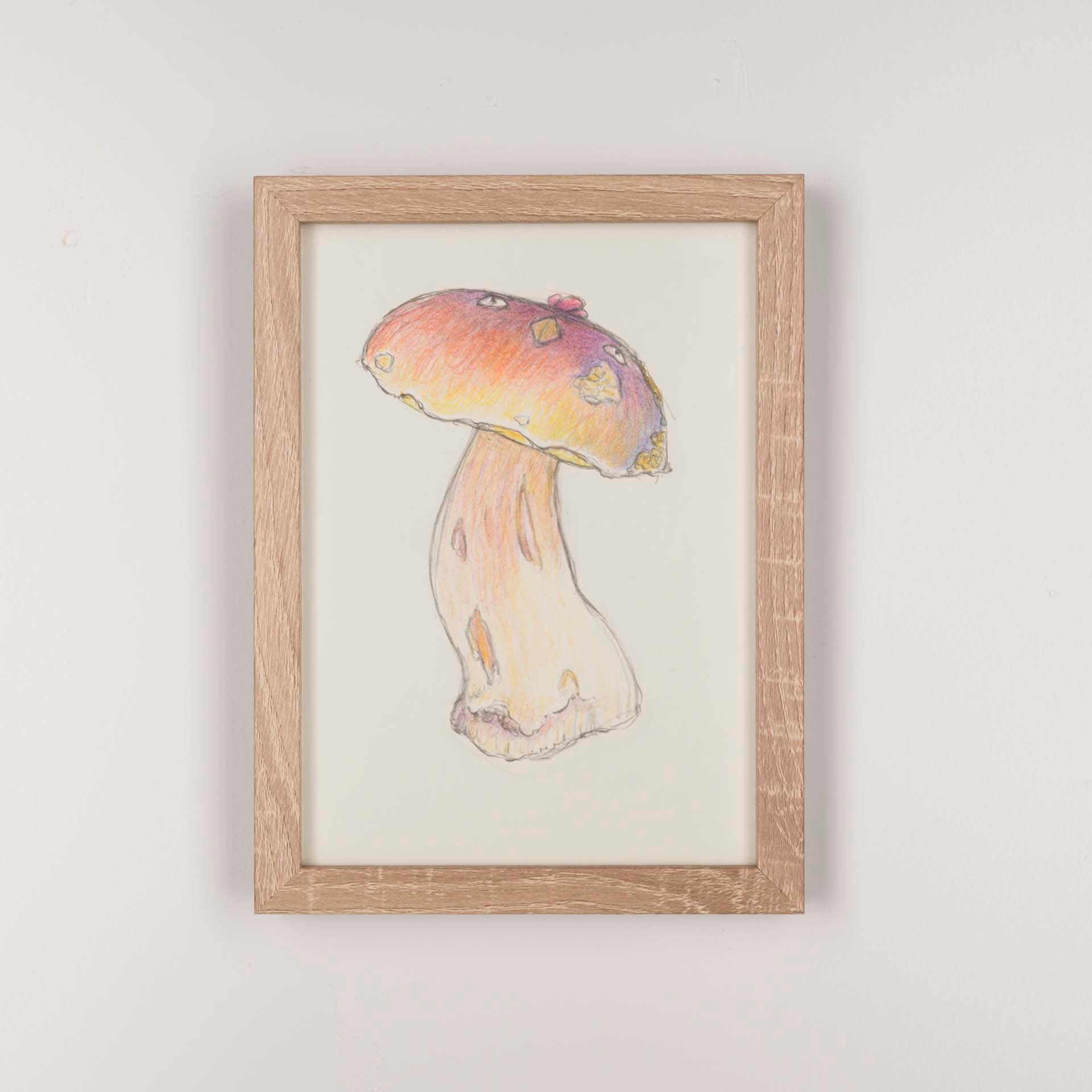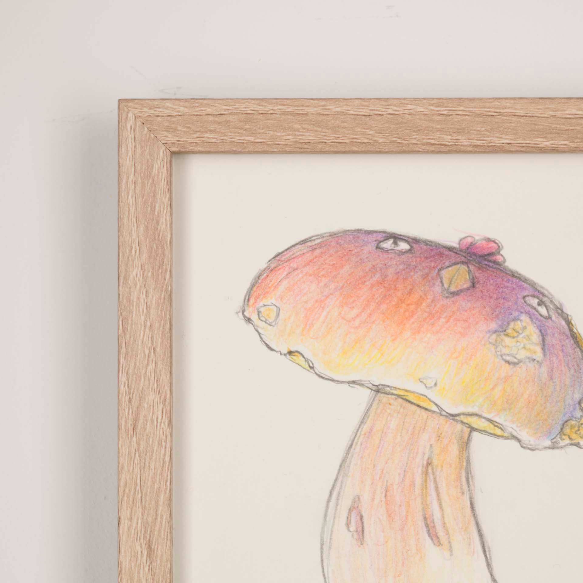 本ドローイング作品は、茸鳥の彫刻制作に先立つデザイン図であると同時に、作家が日々観察したきのこの形態や生態を記録する図鑑的な側面も併せ持つ。造形の起点としてのスケッチでありながら、作家の生命観が滲み出るもうひとつの作品世界として位置づけられている。