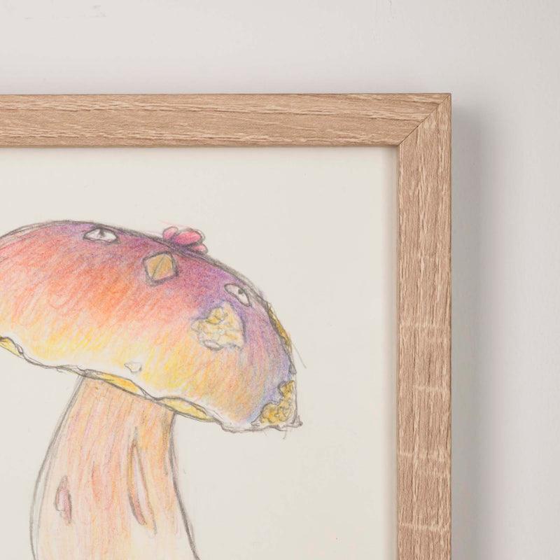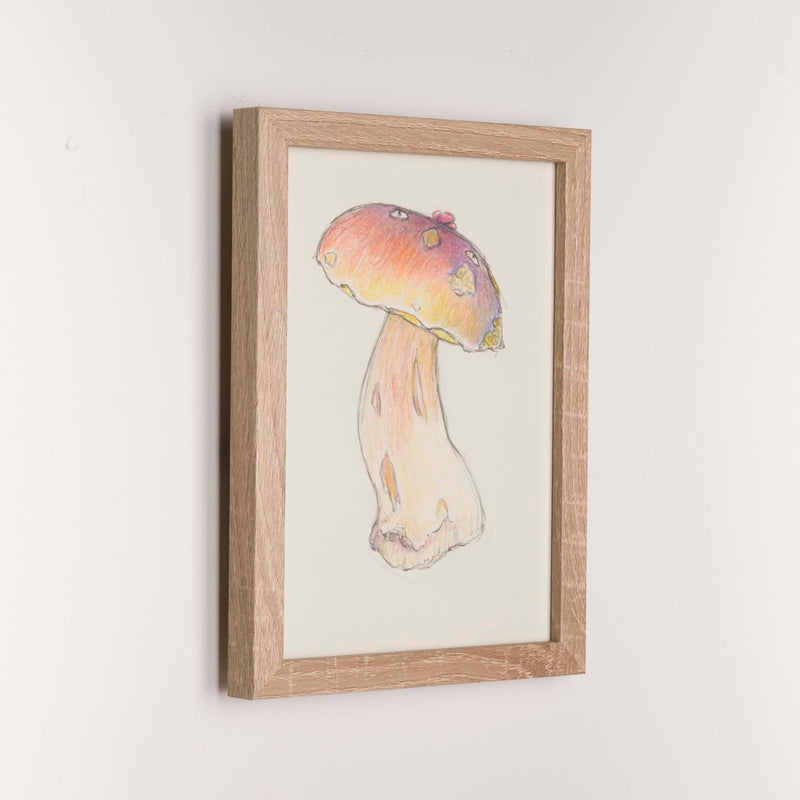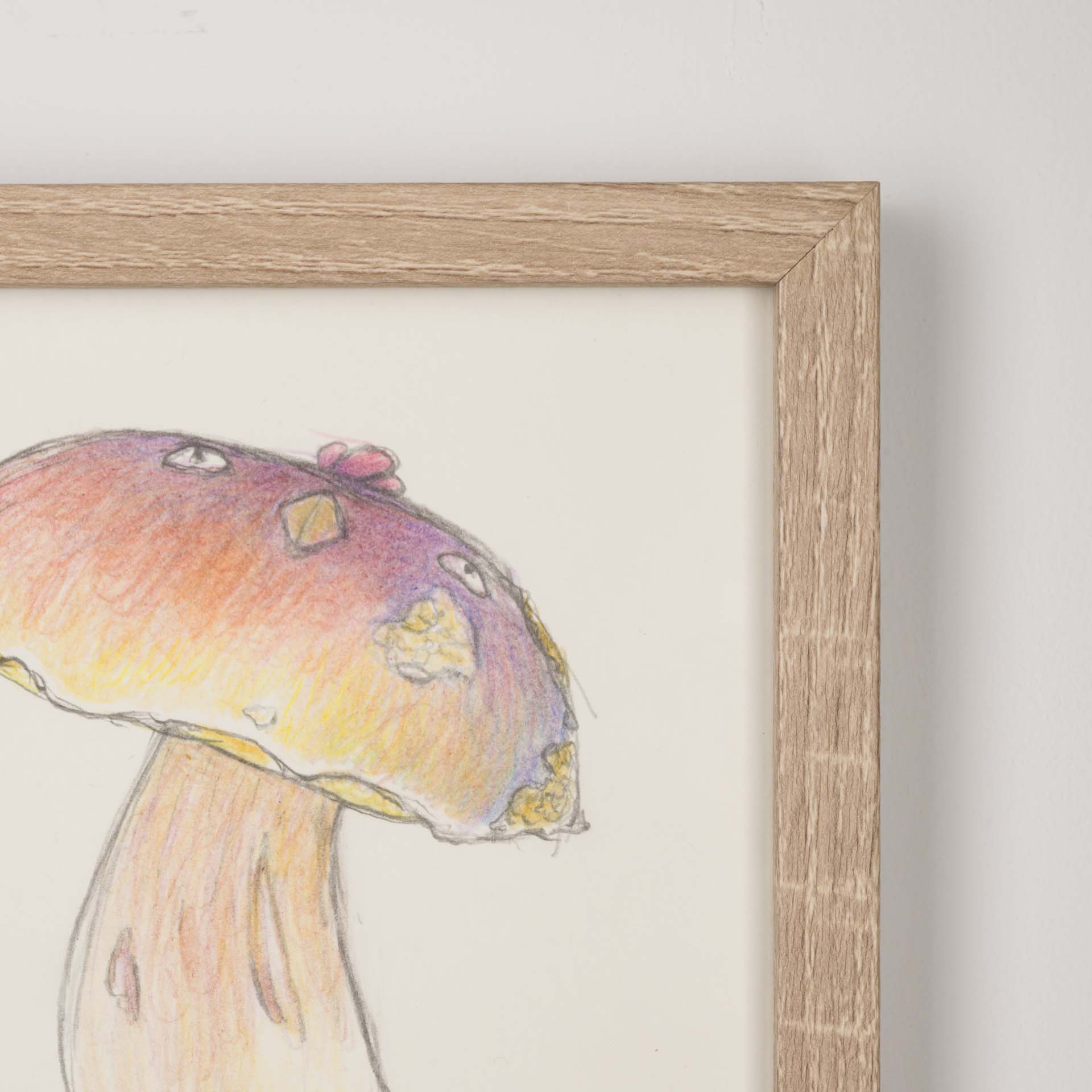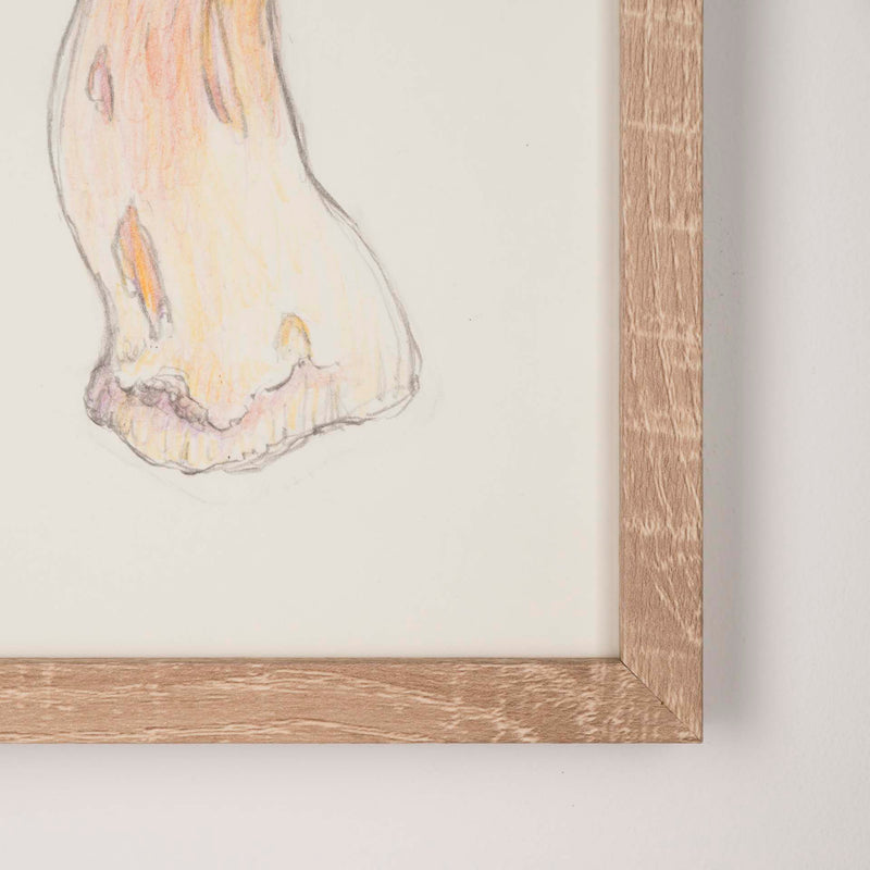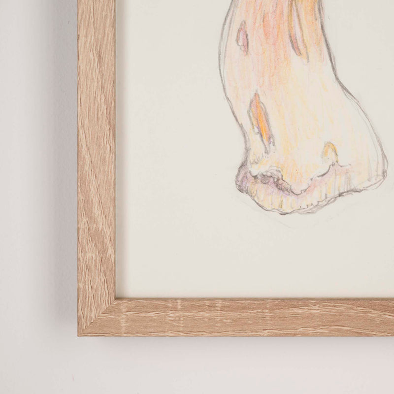 本ドローイング作品は、茸鳥の彫刻制作に先立つデザイン図であると同時に、作家が日々観察したきのこの形態や生態を記録する図鑑的な側面も併せ持つ。造形の起点としてのスケッチでありながら、作家の生命観が滲み出るもうひとつの作品世界として位置づけられている。