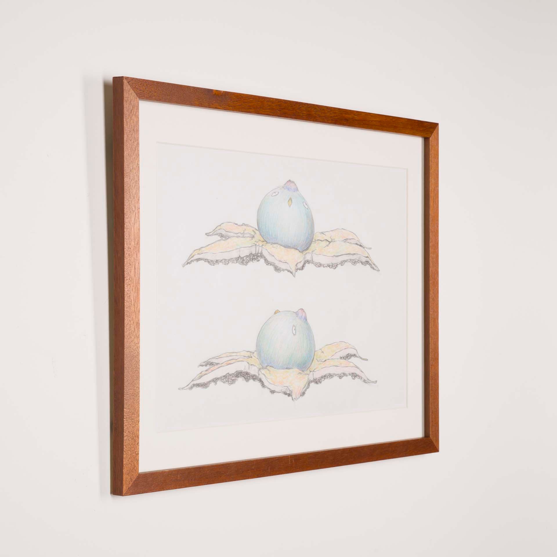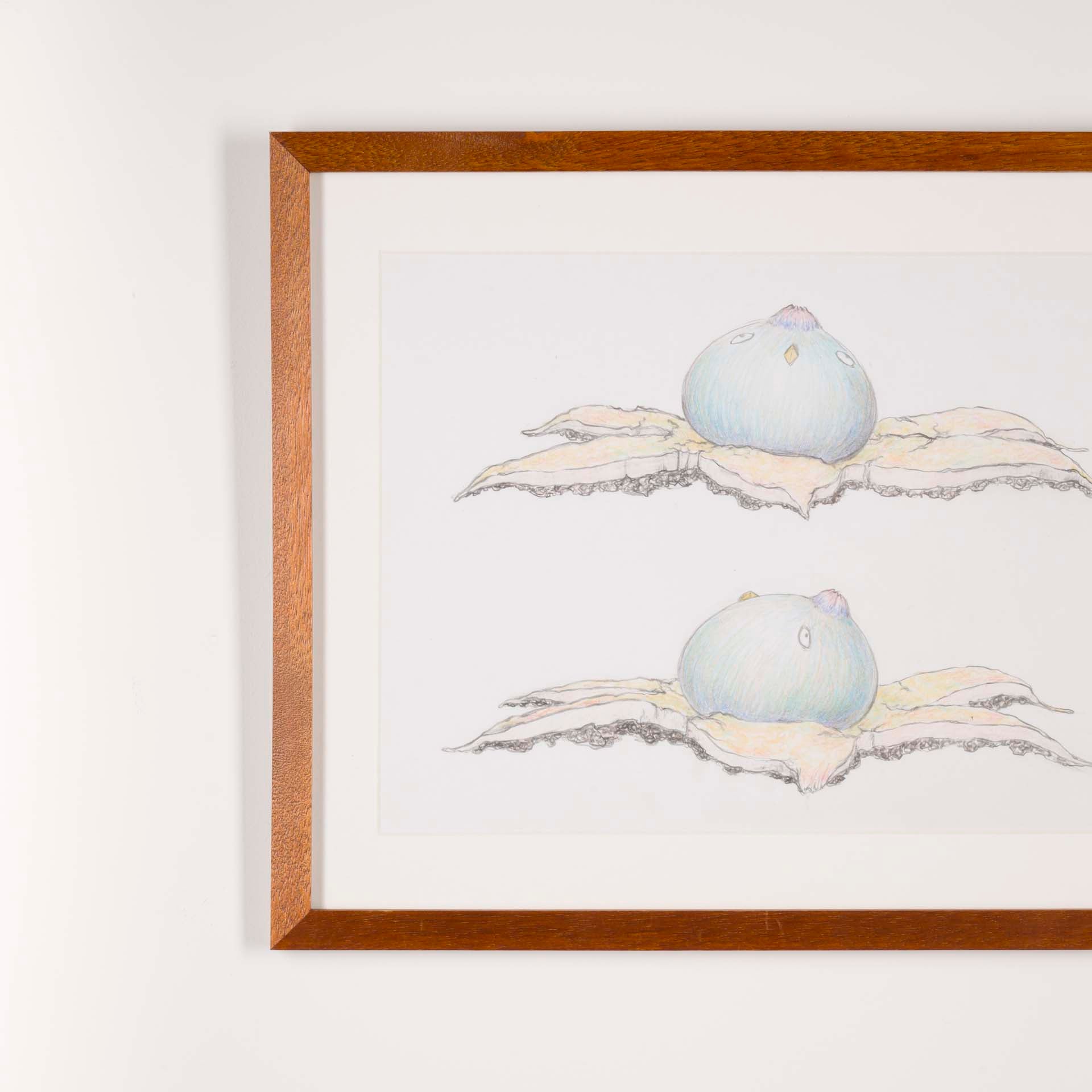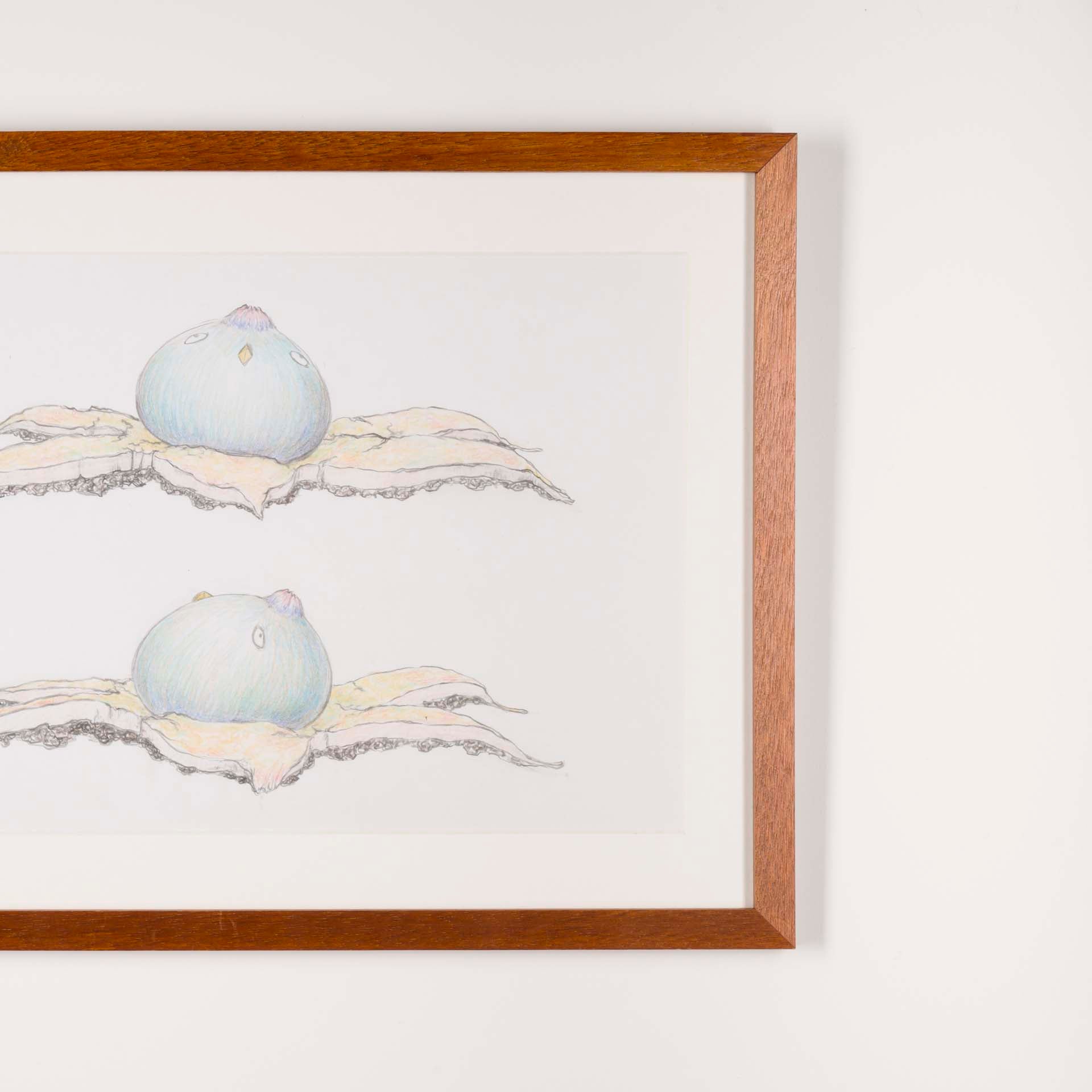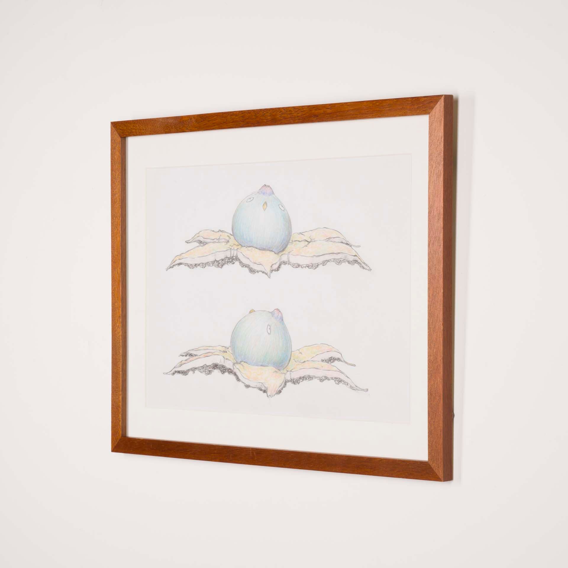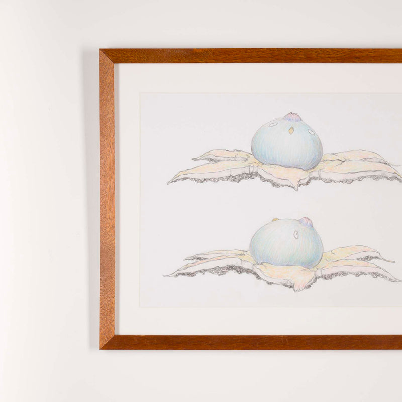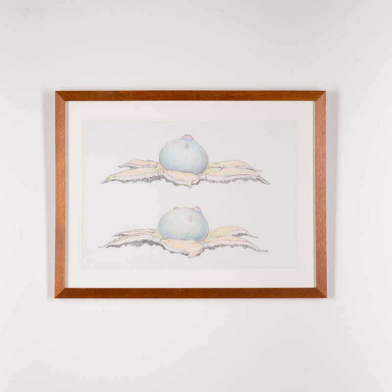 本ドローイング作品は、茸鳥の彫刻制作に先立つデザイン図であると同時に、作家が日々観察したきのこの形態や生態を記録する図鑑的な側面も併せ持つ。造形の起点としてのスケッチでありながら、作家の生命観が滲み出るもうひとつの作品世界として位置づけられている。