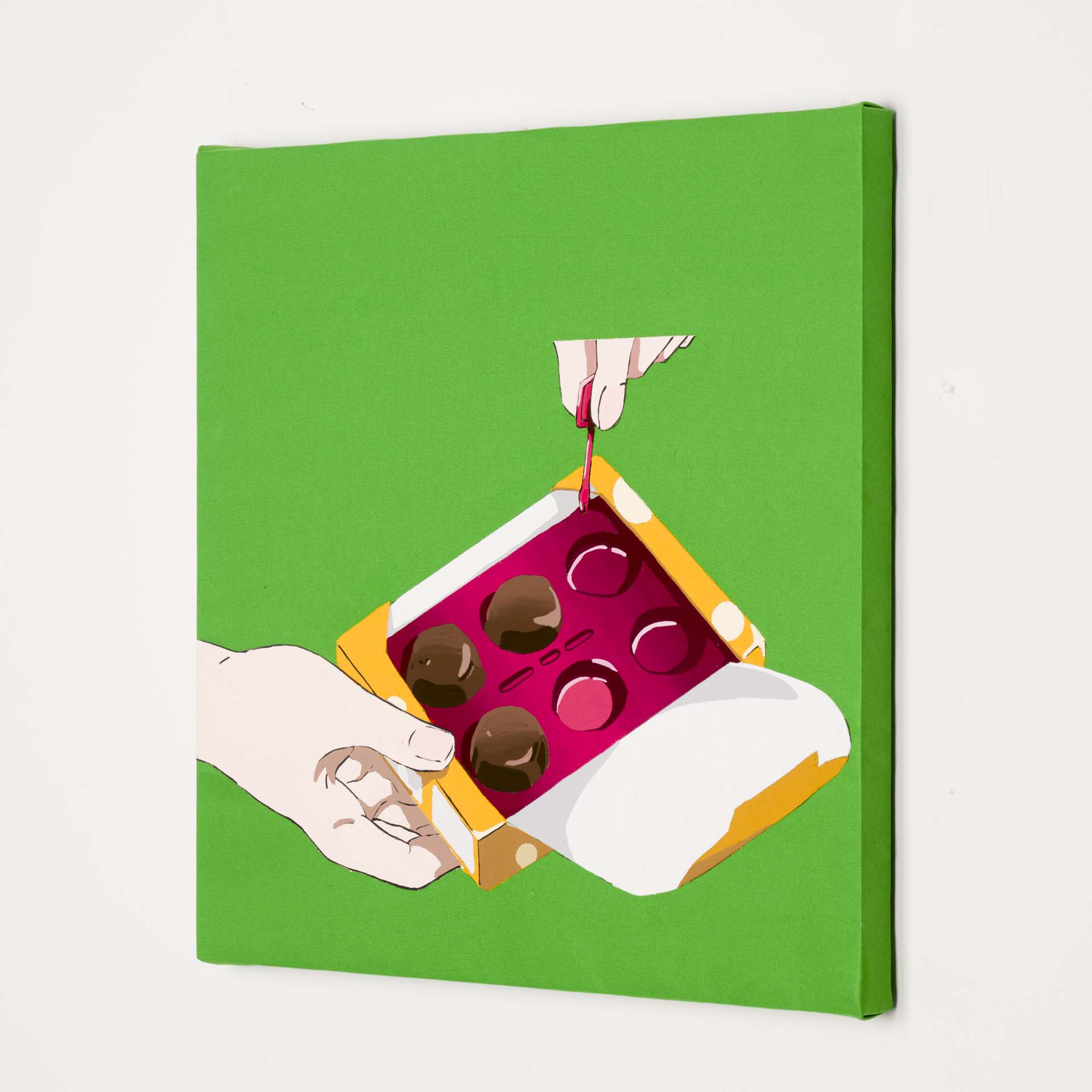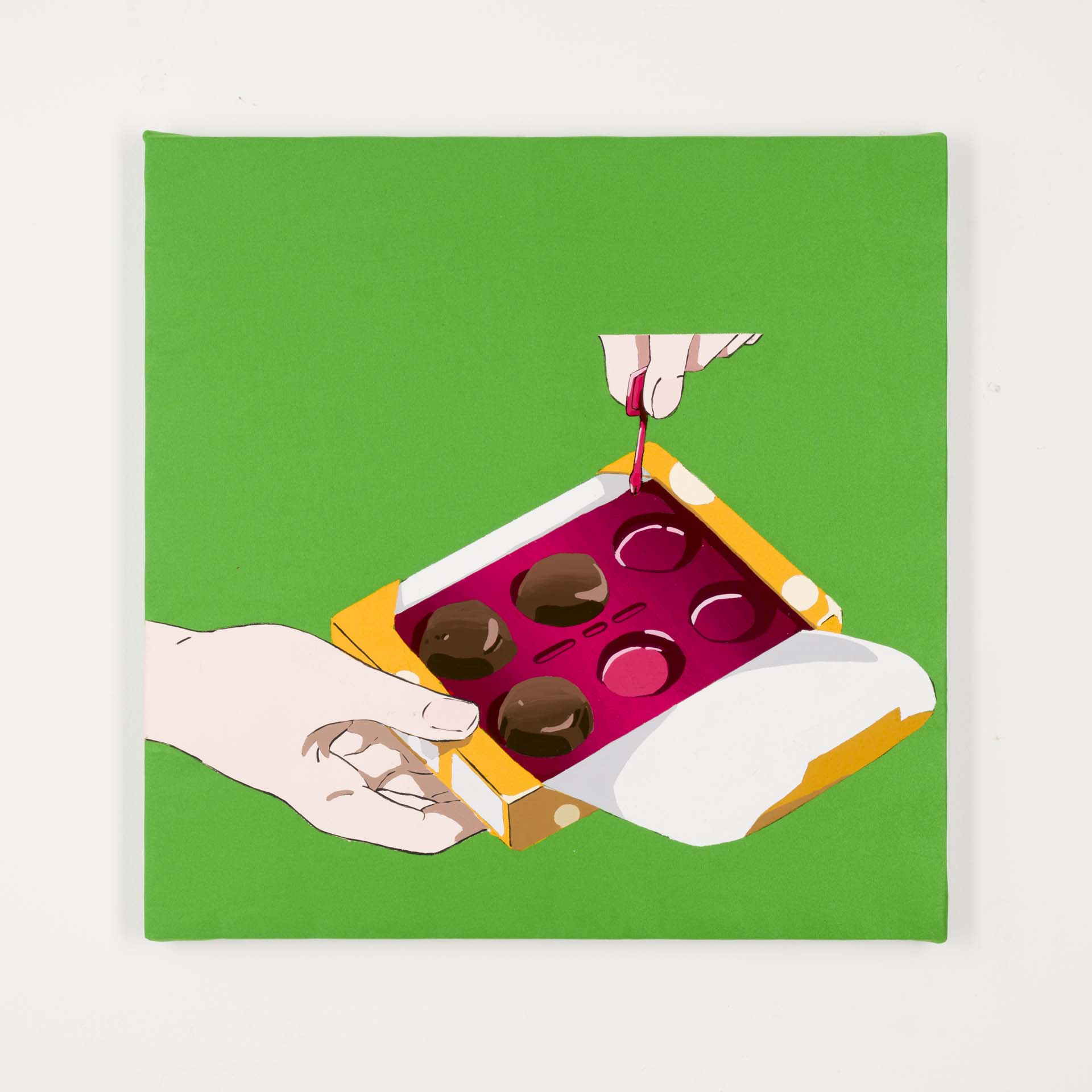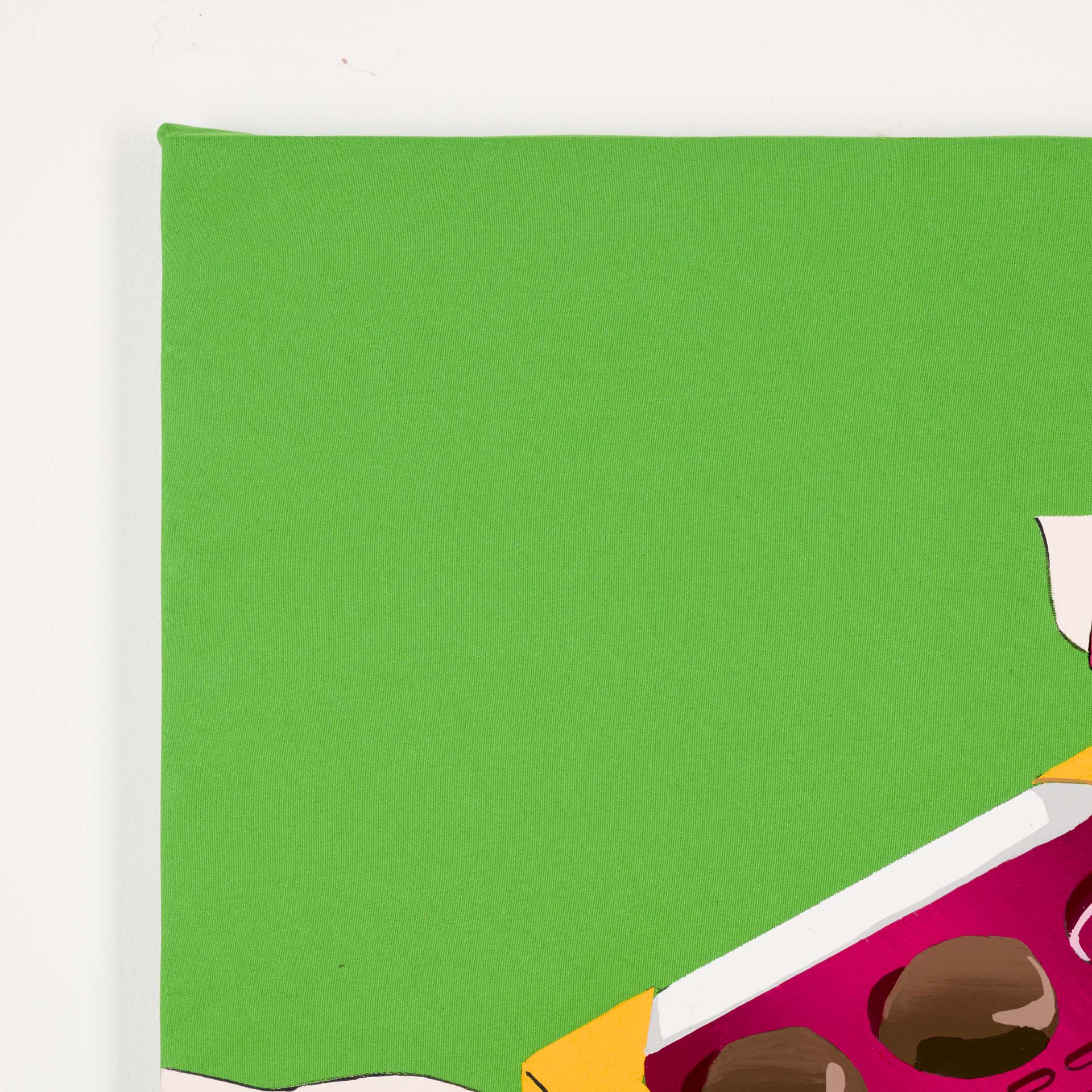 斉木は漫画やアニメーションといったサブカルチャーからの影響を起点に、映像やインターネット、スマートフォン以後の視覚環境を背景とした制作を行っている。グリーンバックやキャンバスにグリーンを作品の支持体に用い、その機能を反転させることで、本来は背景を消去する装置が「消されるもの」「残らないもの」を照らし出す構造を探っている。排除され、可視化されないイメージに意味を見出しながら、現代のイメージ環境を問い直している。