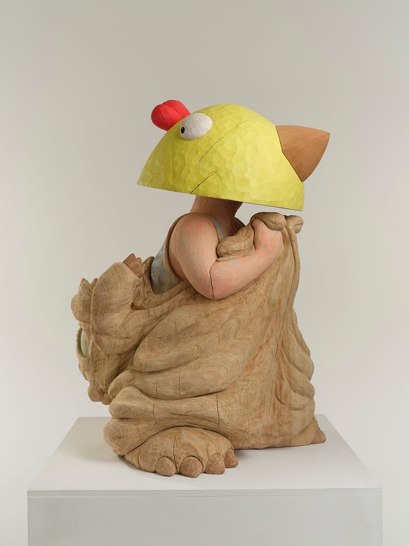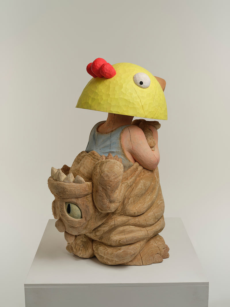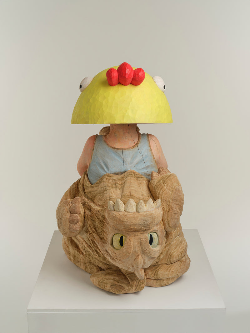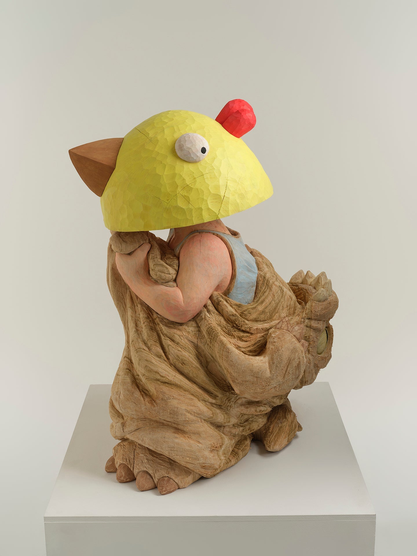 作家自身が創造したキャラクター「奈奈生」シリーズ。伝統的な木彫技術を用い、身体には楠木、頭部には檜木を使用することで、素材の違いが生む奥行きと豊かさを表現している。卯榫構造によって安定性を高め、立体感をより際立たせている点も特徴的である。恐竜を思わせるパジャマ部分はチェンソーで大まかに成形し、木材本来の質感を活かしながら、細部は彫刻刀やヤスリによって丁寧に仕上げられている。アクリル絵具による彩色は、木の温かみを残しつつ、変化を恐れず受け入れる力強さを象徴する。
