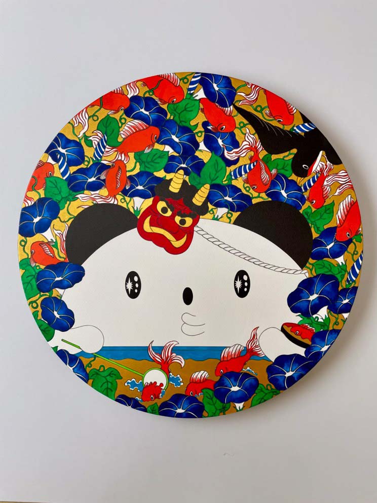 あごぱんの作品に描かれるパンダたちは、愛らしさの中に静かな神秘性をたたえ、現実と幻想の境界に存在する。ユーモラスで親しみやすいモチーフでありながら、構図や色彩には江戸絵画を思わせる格調が漂う。軽やかな筆致と柔らかな世界観の中で描かれる無垢なパンダたちの姿は、日常の中に潜む理想郷を静かに浮かび上がらせる。
