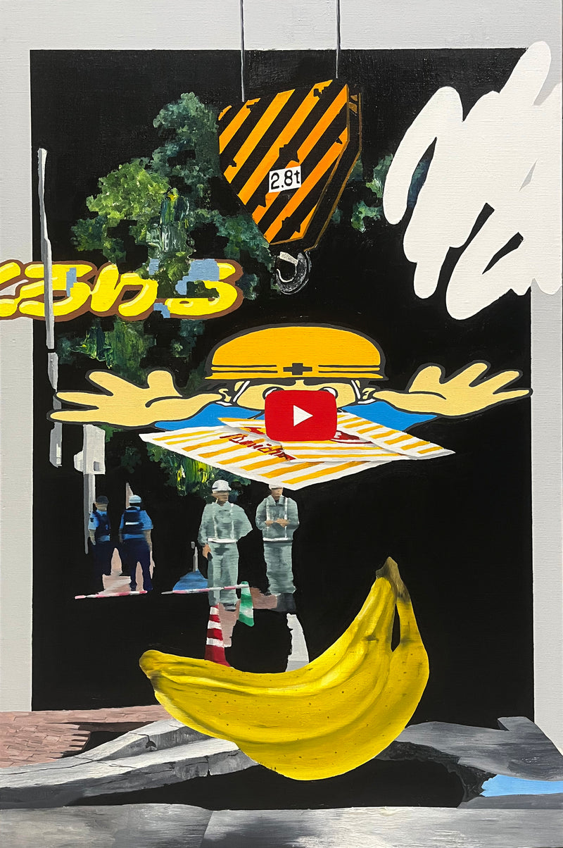 本作は、昨年福岡・今泉で発生した道路陥没の現場をもとに制作されたものである。作家自身も現地を訪れたが、穴はわずか一日で修復され、あたかも何事もなかったかのように日常が回復していた。 その背後には、戦後インフラの限界や、足元の不確かさといった問題が横たわっている。都市の運営上、こうした出来事は忘却されることが望まれているのかもしれない。斉木は、そうした不可視化されていく事実と、風化していく記憶を引き留める試みとして、本作を提示している。