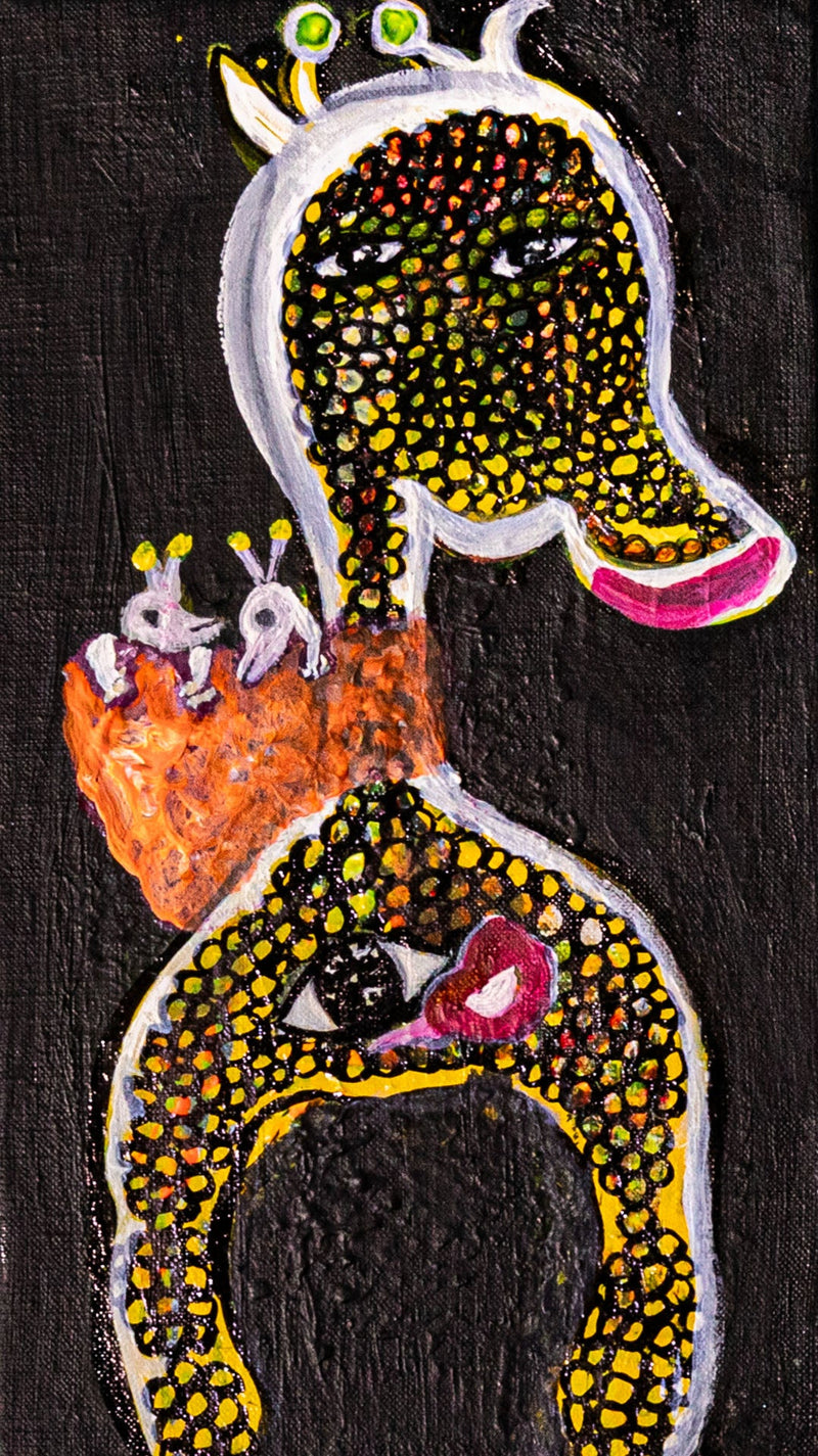 クレヨンやアクリル絵具、サインペンと画材を自由に駆使し抽象めいた具象画や絵本の挿絵のような作品等々広い世界観を展開する、アーティスト・浅野順子。1950年神奈川県横浜市出身。俳優の浅野忠信が実子、現在モデル、アーティストとして活躍するSUMIREは孫にあたる。