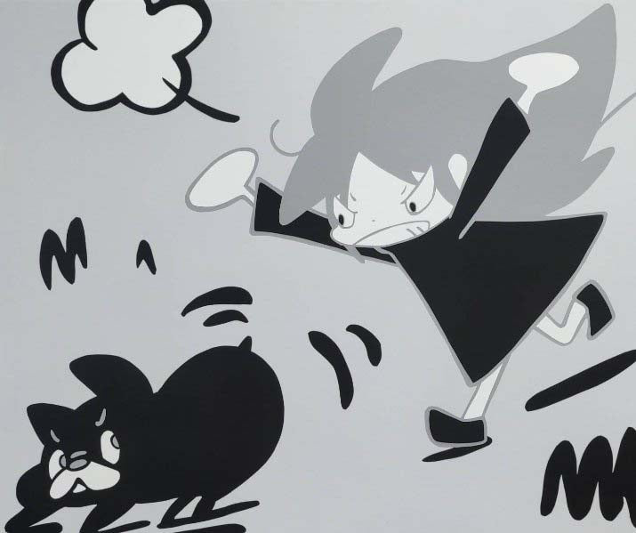 カメ子カメ男の作品に描かれる少女たちは、苛立ちと諦めの間をたゆたいながら、静かな眼差しで世界を見つめる。傍らの動物たちは、失われた存在の記憶を象徴するように寄り添う。愛犬との別れをきっかけに灰色を基調としたモノクロームの世界へ移行した作品には、儚くも確かな「生」の残響と、その裏に潜む孤独が静かに息づいている。