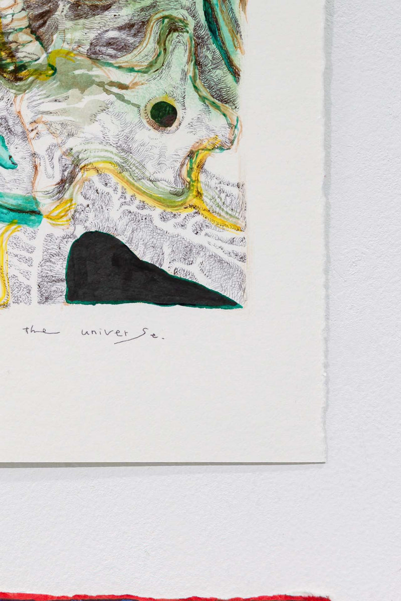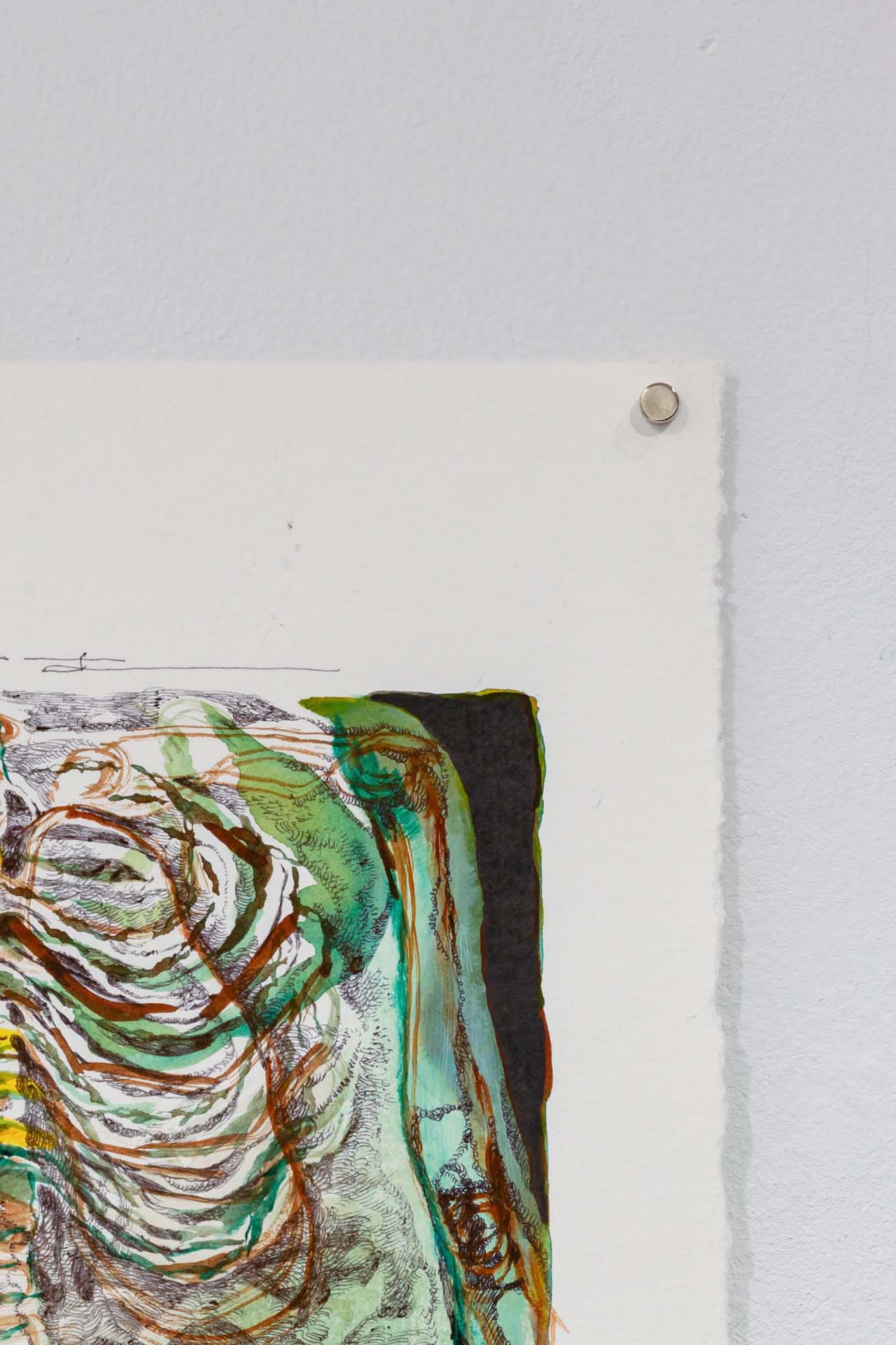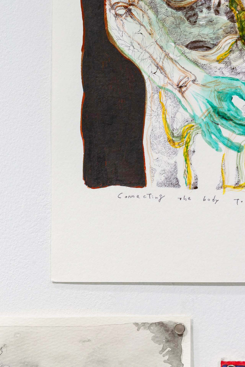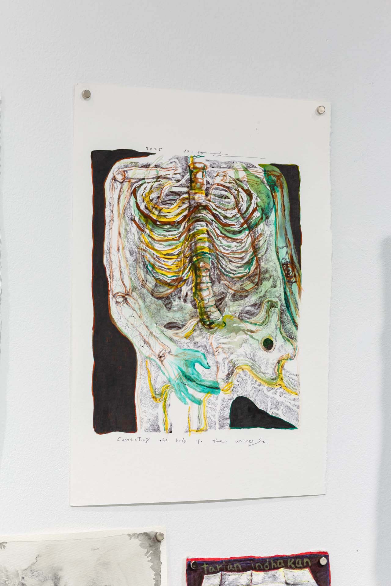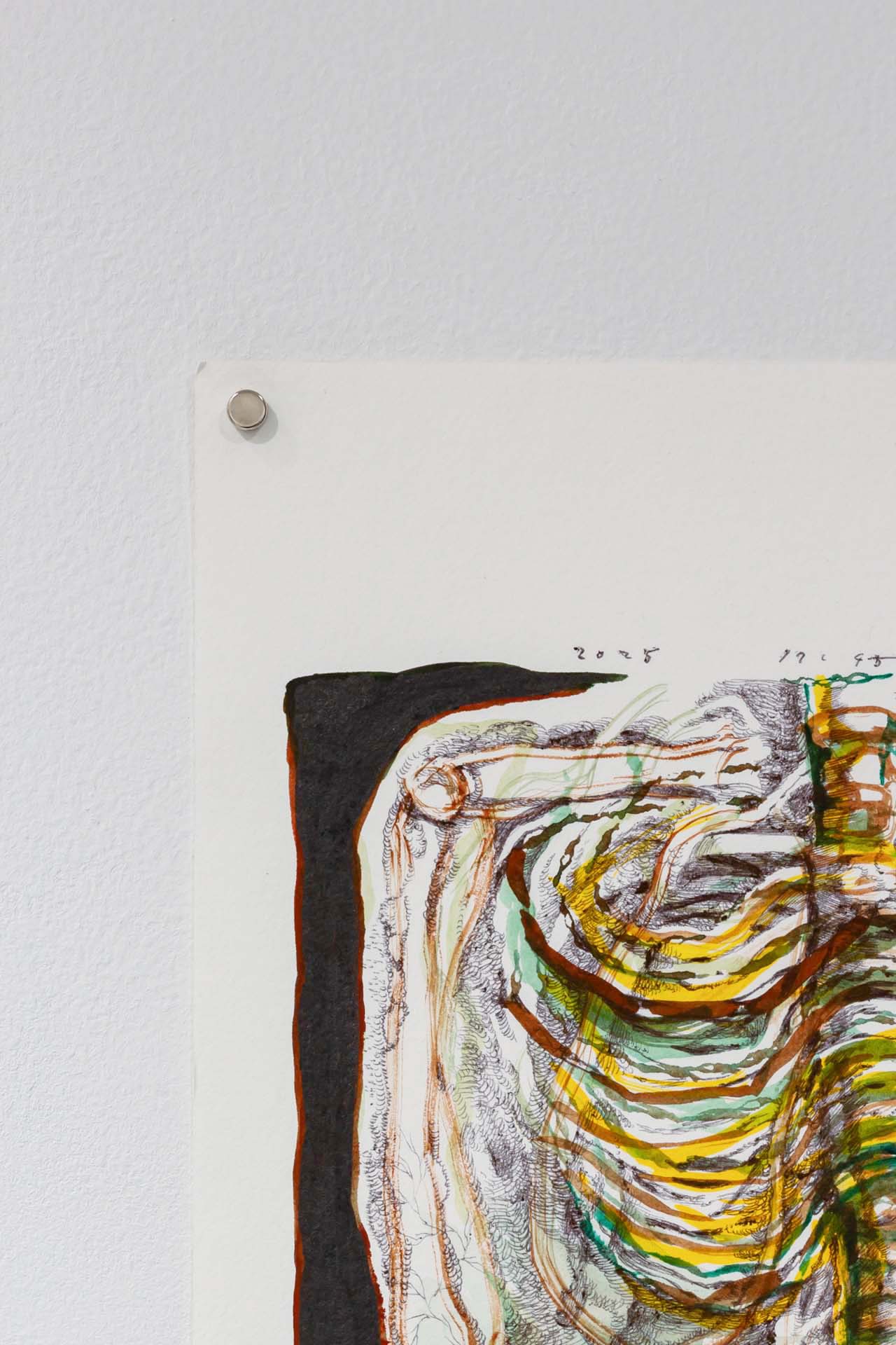 安藤圭汰の作品は、身体と風景が溶け合うようなイメージを通して、生と死の境界が揺らぐ瞬間を描くことを特徴としている。本展《灼熱と腐敗/凍寒と発芽》では、化石標本のような鳥や、山脈や血管を思わせる線描を用い、成長と腐敗、凍結と保存といった異なる生命の時間を重ね合わせる。そうした表現から、生と死のどちらにも偏らない「中庸」の感覚を浮かび上がらせるとともに、新作と同時代作家の作品を併置する構成によって、絵画を他者との関係のなかで変化し続ける表現として提示している。