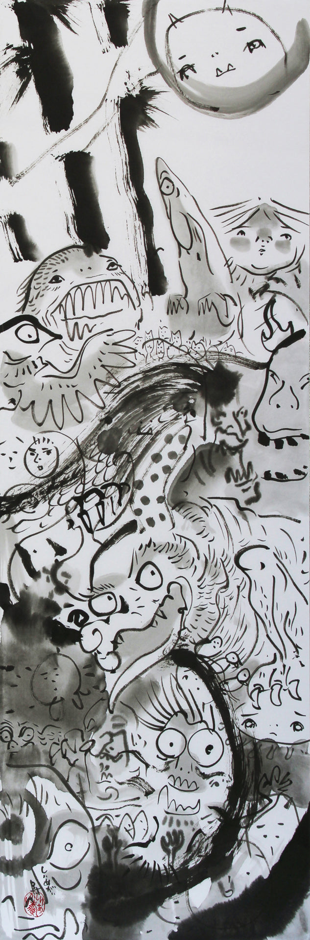 漫画家・しりあがり寿が挑むテーマは「地獄」。会場を覆う大判紙に鬼や妖怪を描いたインスタレーションや墨絵・板絵により、“カワイイ”をフィルターにした現代社会の矛盾を映し出します。恐怖ではなくゆるさをまとった地獄は、安心の裏にある不安や絶望を照らし出し、ユーモアと批評性をあわせ持つしりあがり独自の世界を体験できます。