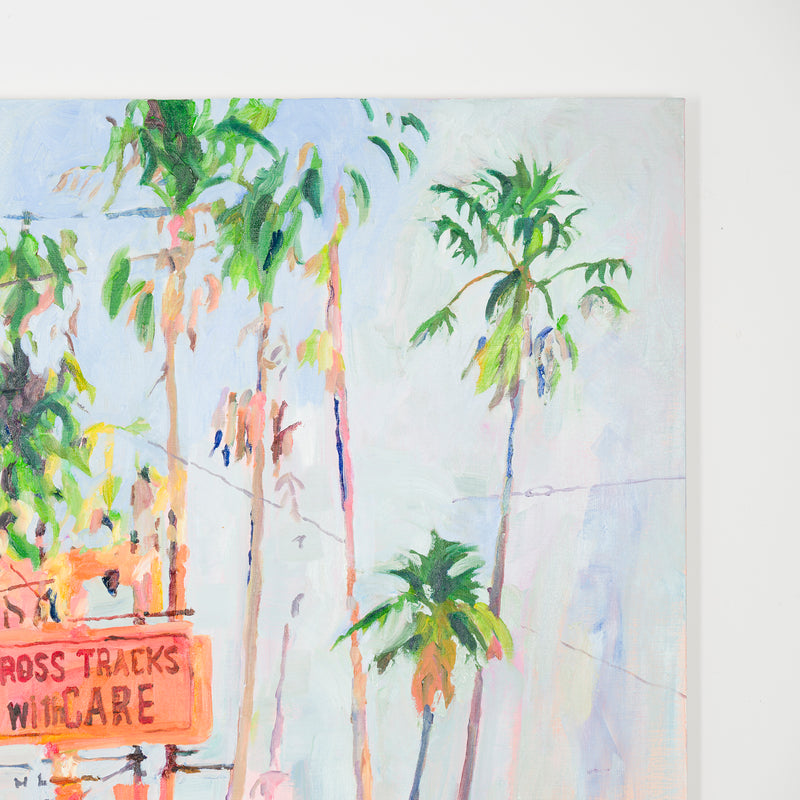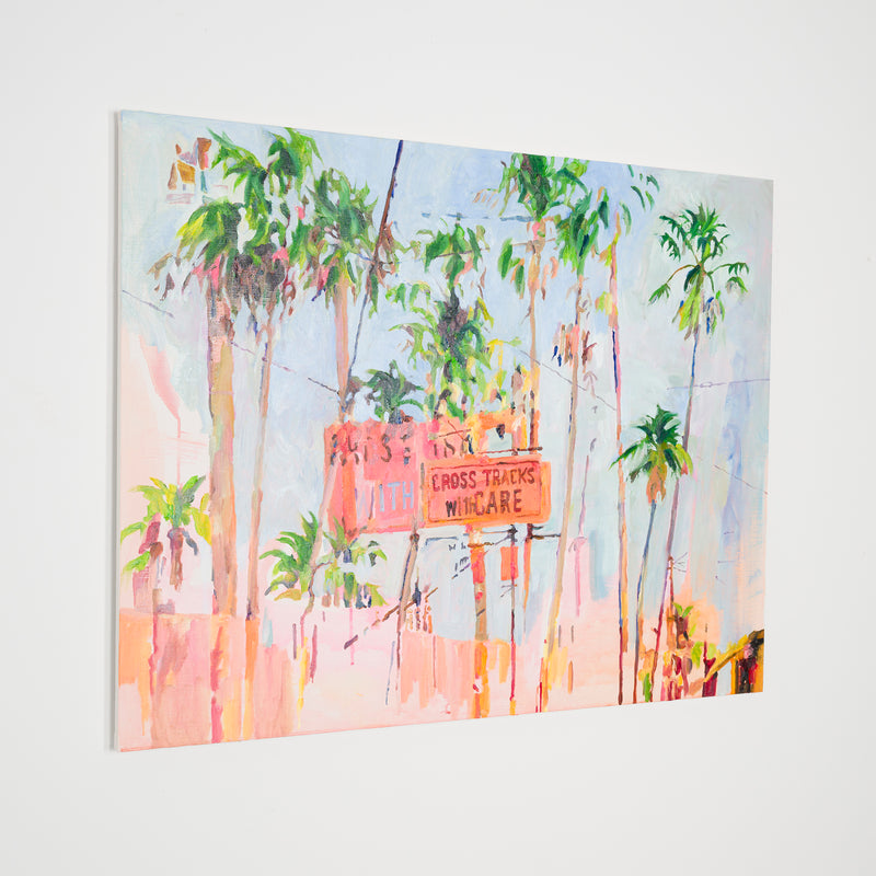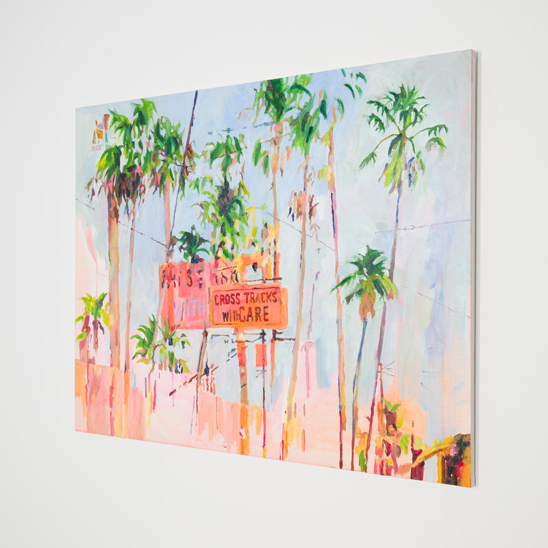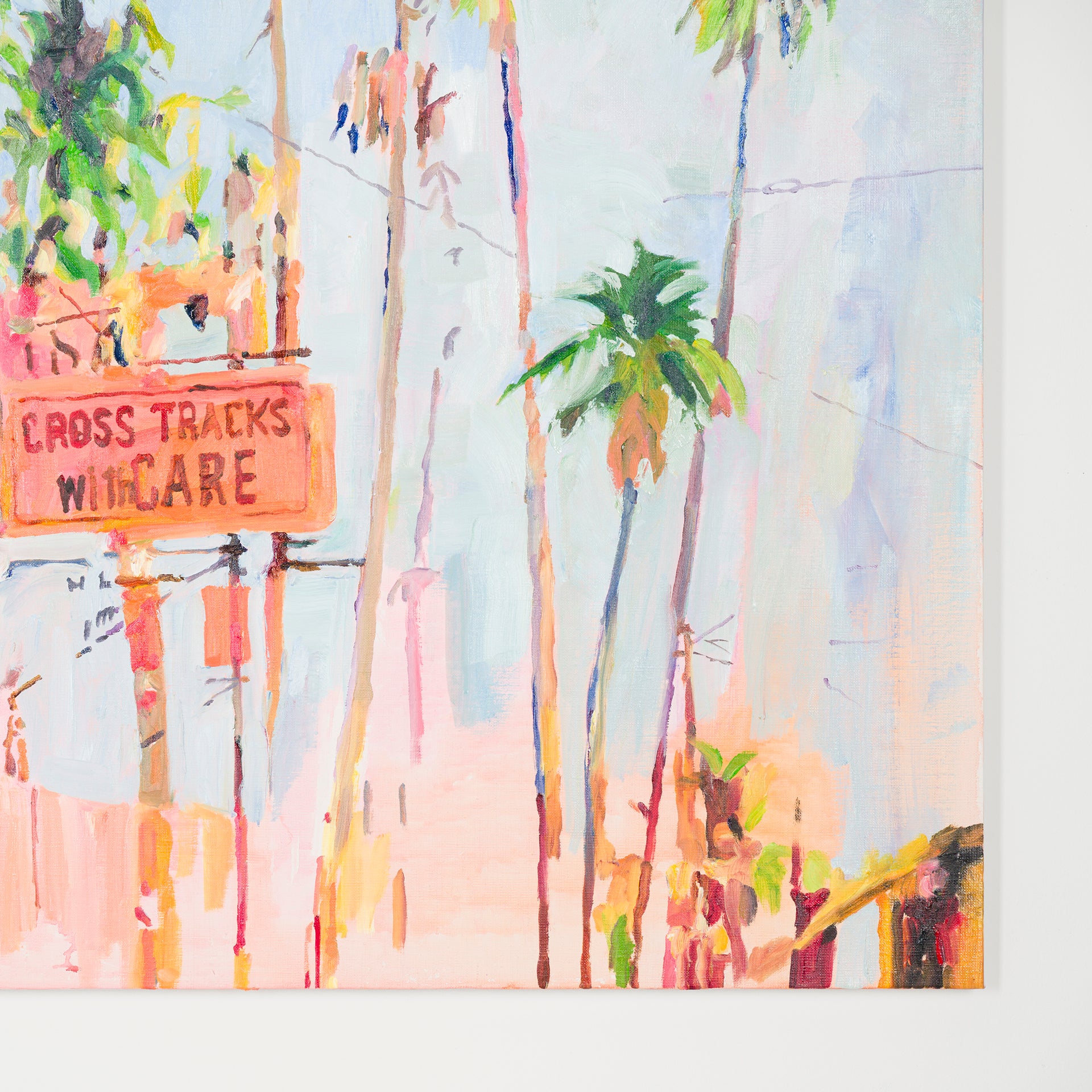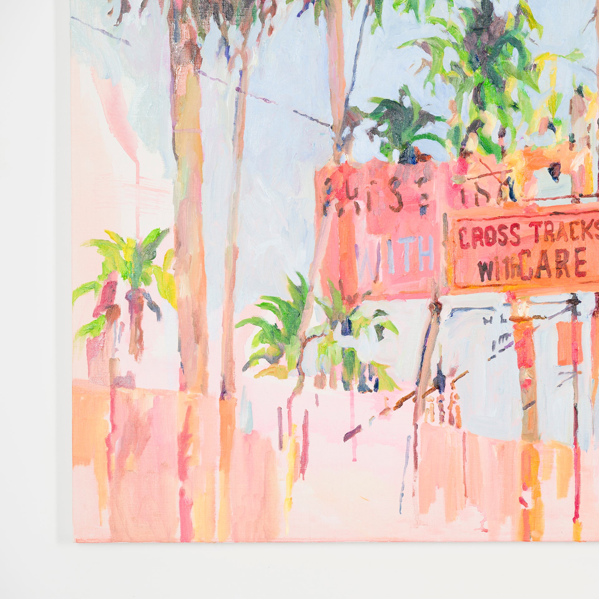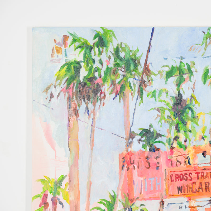 本展では、Googleストリートビューから抽出した世界中の街角の断片を重ね合わせ、どこにも存在しない“交差”の風景を描き出している。標識や看板といった誰にとっても同じ意味をもつ記号に、作家が感じる偶然や記憶の揺らぎが折り重なり、現実と心象が交錯する新しい風景画として立ち上がる。デジタルのバグや異なる時系列のズレといった偶然性を受け入れながら、辰巳は心で感じた色の組み合わせに導かれるように、画面に豊かな奥行きを刻んでいく。