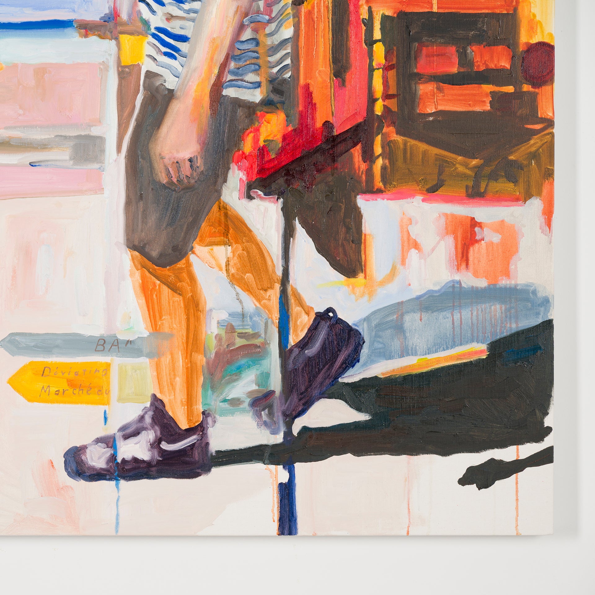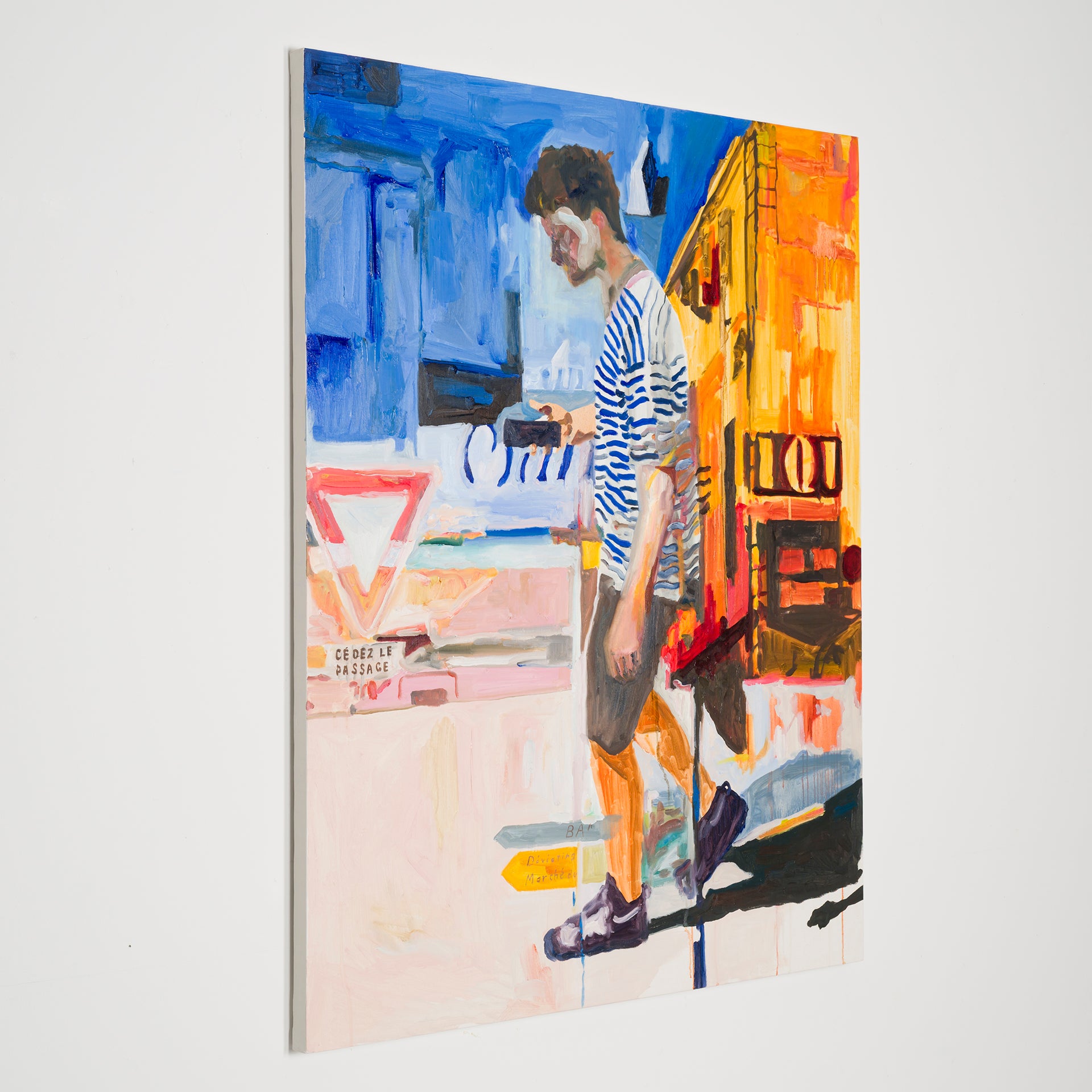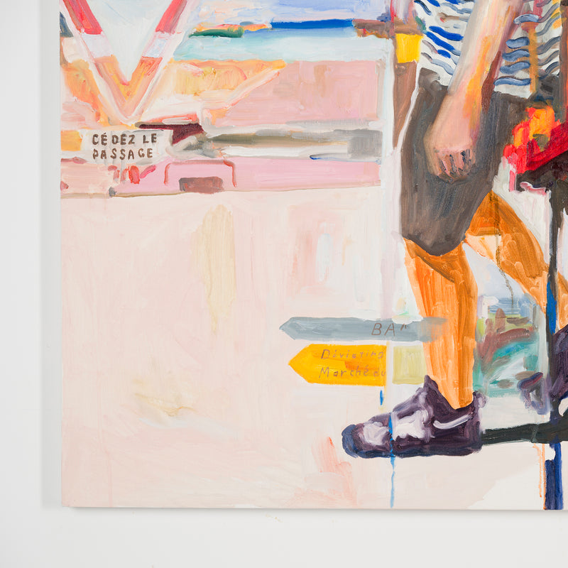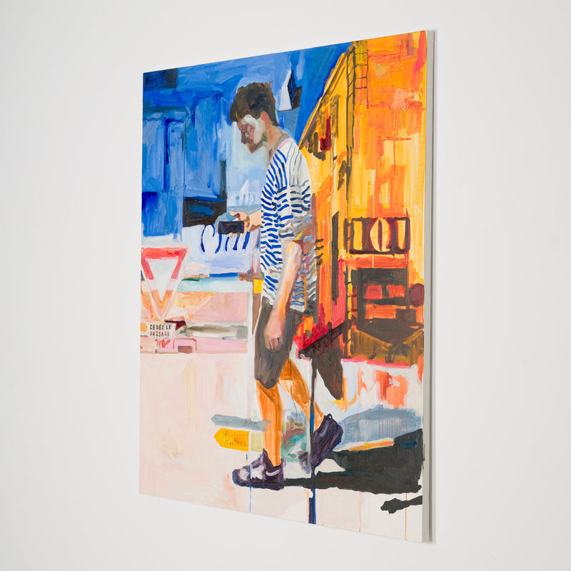 本展では、Googleストリートビューから抽出した世界中の街角の断片を重ね合わせ、どこにも存在しない“交差”の風景を描き出している。標識や看板といった誰にとっても同じ意味をもつ記号に、作家が感じる偶然や記憶の揺らぎが折り重なり、現実と心象が交錯する新しい風景画として立ち上がる。デジタルのバグや異なる時系列のズレといった偶然性を受け入れながら、辰巳は心で感じた色の組み合わせに導かれるように、画面に豊かな奥行きを刻んでいく。