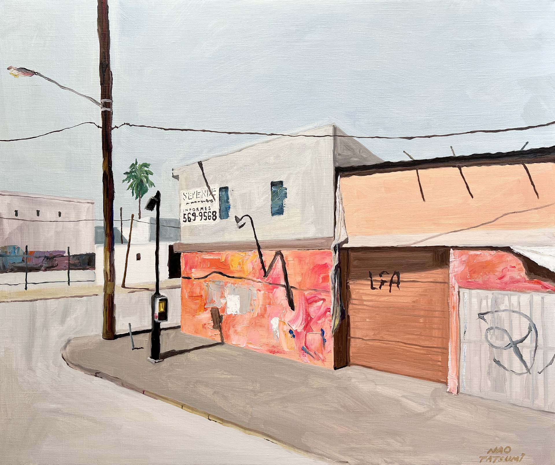 本展では、Googleストリートビューから抽出した世界中の街角の断片を重ね合わせ、どこにも存在しない“交差”の風景を描き出している。標識や看板といった誰にとっても同じ意味をもつ記号に、作家が感じる偶然や記憶の揺らぎが折り重なり、現実と心象が交錯する新しい風景画として立ち上がる。デジタルのバグや異なる時系列のズレといった偶然性を受け入れながら、辰巳は心で感じた色の組み合わせに導かれるように、画面に豊かな奥行きを刻んでいく。
