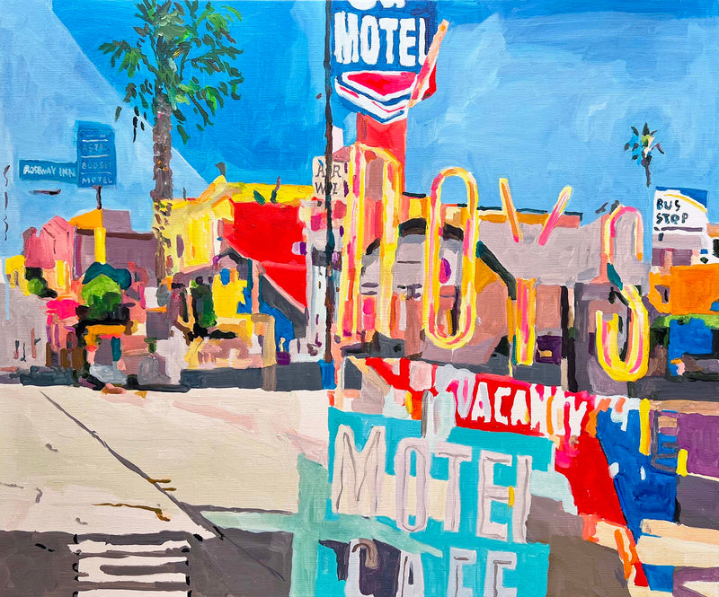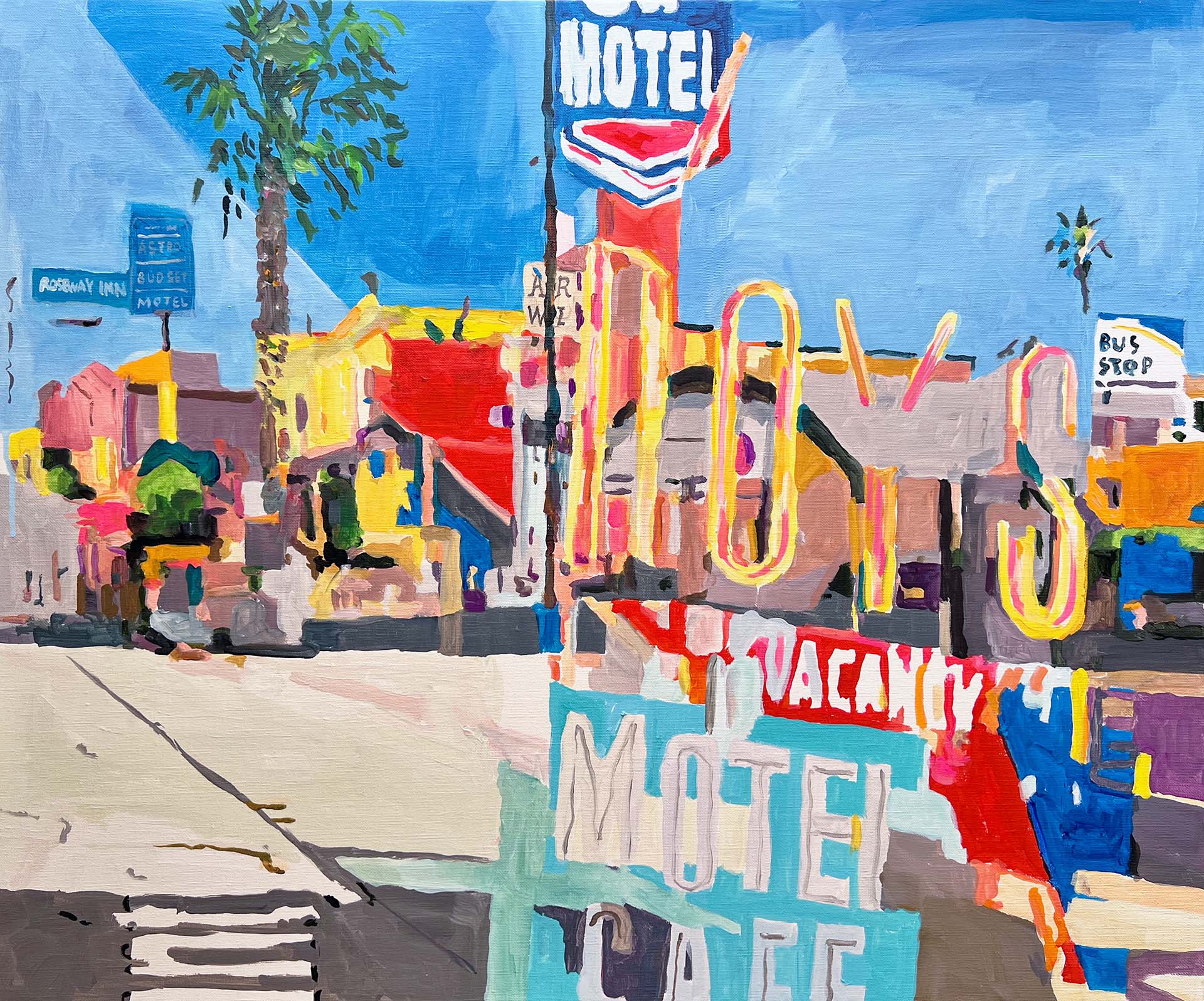 本展では、Googleストリートビューから抽出した世界中の街角の断片を重ね合わせ、どこにも存在しない“交差”の風景を描き出している。標識や看板といった誰にとっても同じ意味をもつ記号に、作家が感じる偶然や記憶の揺らぎが折り重なり、現実と心象が交錯する新しい風景画として立ち上がる。デジタルのバグや異なる時系列のズレといった偶然性を受け入れながら、辰巳は心で感じた色の組み合わせに導かれるように、画面に豊かな奥行きを刻んでいく。