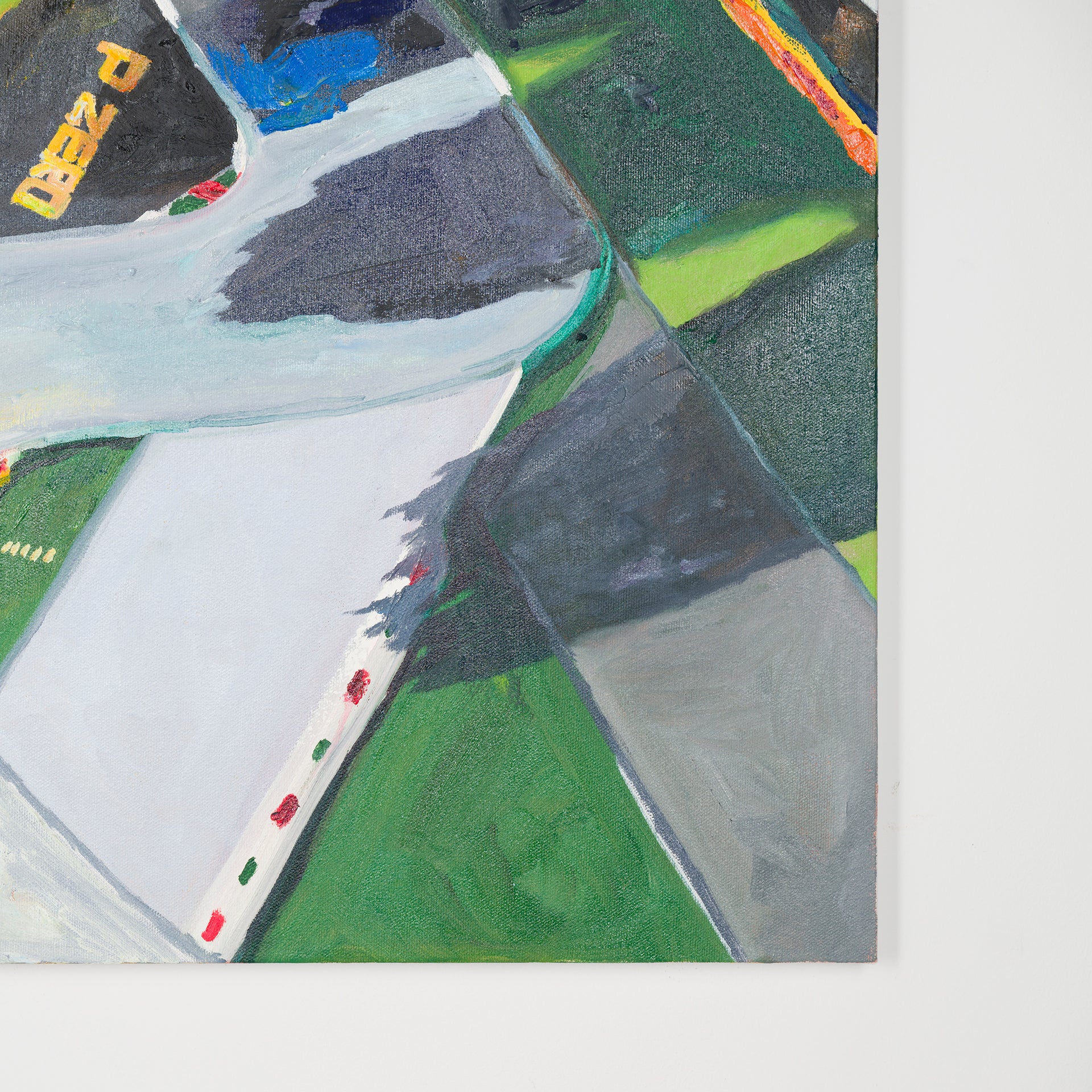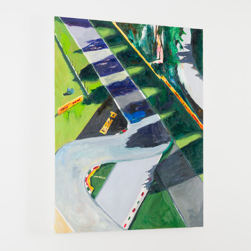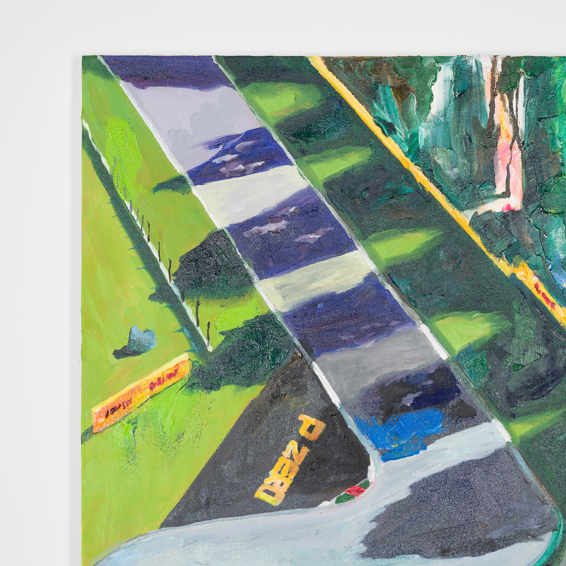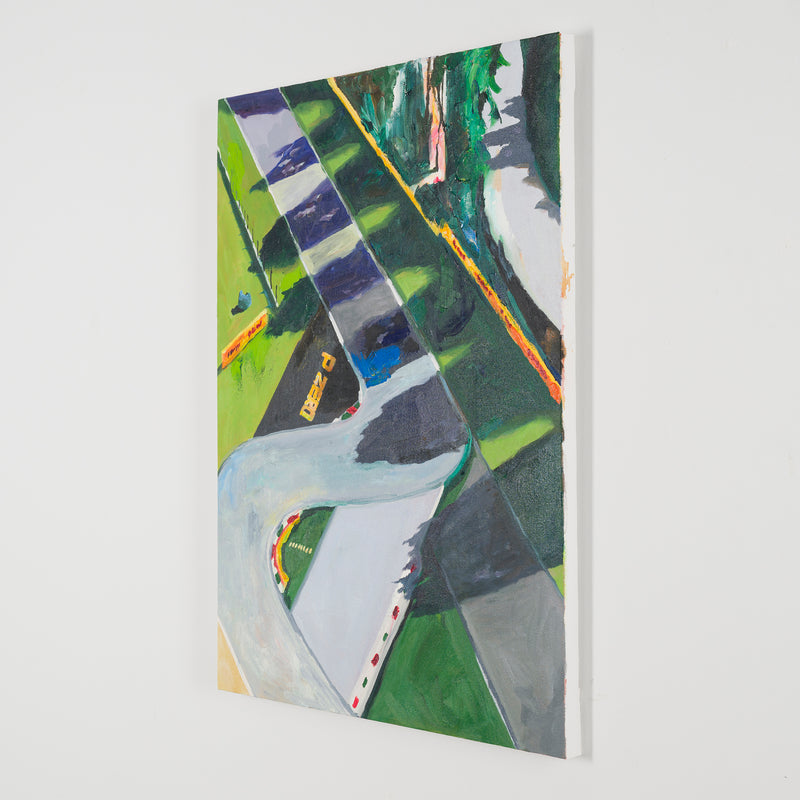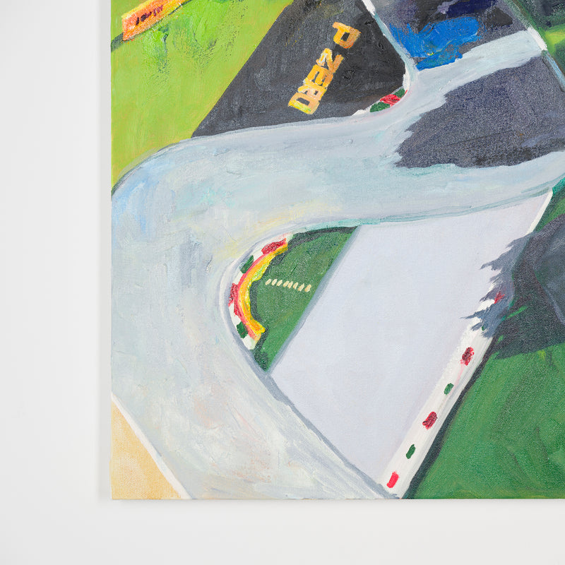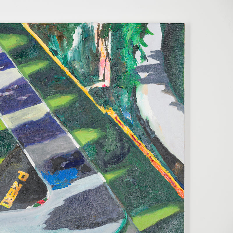 本展では、Googleストリートビューから抽出した世界中の街角の断片を重ね合わせ、どこにも存在しない“交差”の風景を描き出している。標識や看板といった誰にとっても同じ意味をもつ記号に、作家が感じる偶然や記憶の揺らぎが折り重なり、現実と心象が交錯する新しい風景画として立ち上がる。デジタルのバグや異なる時系列のズレといった偶然性を受け入れながら、辰巳は心で感じた色の組み合わせに導かれるように、画面に豊かな奥行きを刻んでいく。