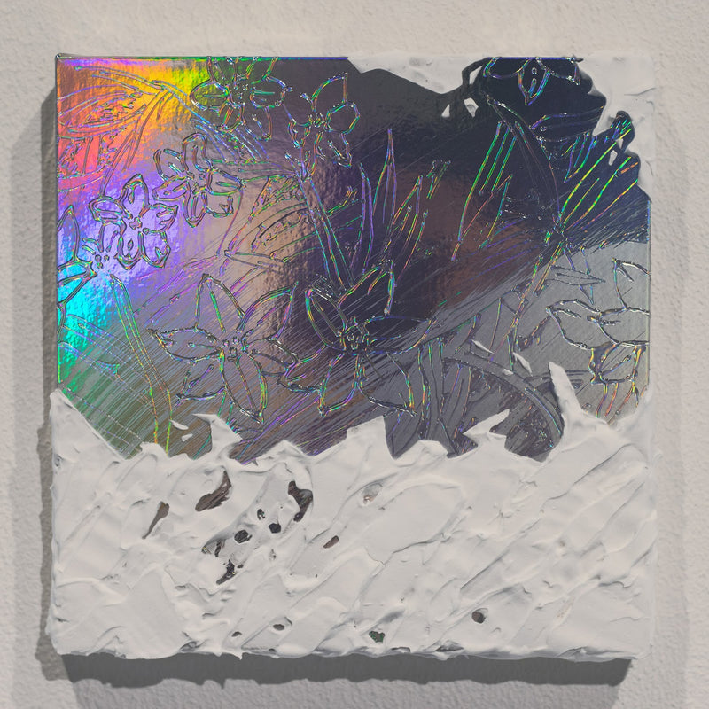 ホログラム素材に透明な絵の具を重ねる独自技法による作品。見る角度によって表情が変化し、光の屈折によって特定の色に限定されない多層的な輝きを放ちながら虹色の光が浮かび上がる。鑑賞者の視点によって像が変容する構造は、現実の多面性を可視化し、固定された見方を超えて変化し続ける可能性を提示している。