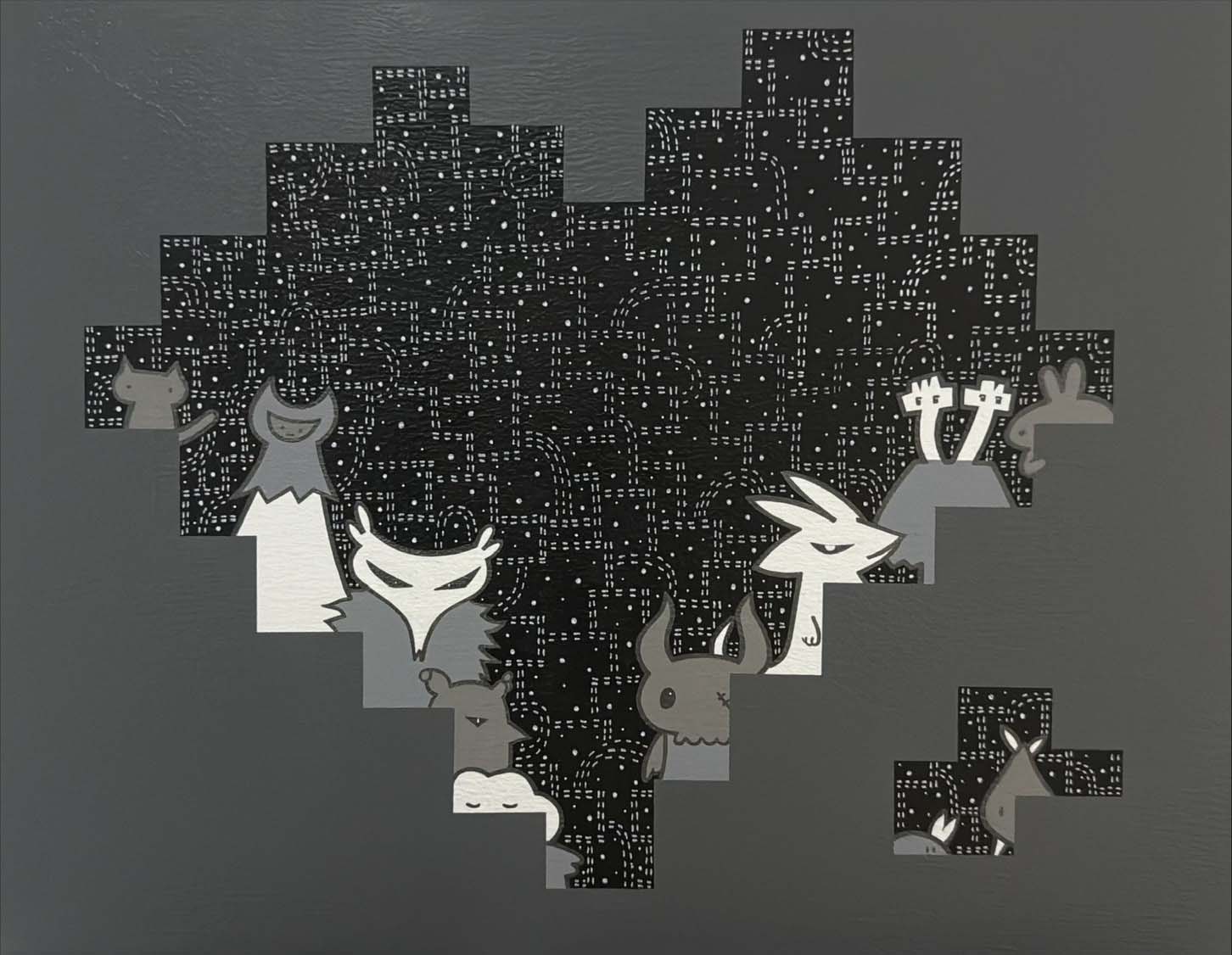 弓指貴弘は、古来より恐れの象徴とされてきた鬼を、ポップなキャラクターとして再構築している。シリーズ《toon demon》や《mirror of the soul》では、情報社会における自我のあり方や、人の内面に潜む不安を静かに映し出す。低明度の色彩と簡潔な構成が生み出す夢幻的な空気には、形なきものへの畏れと日本的な感性が滲む。