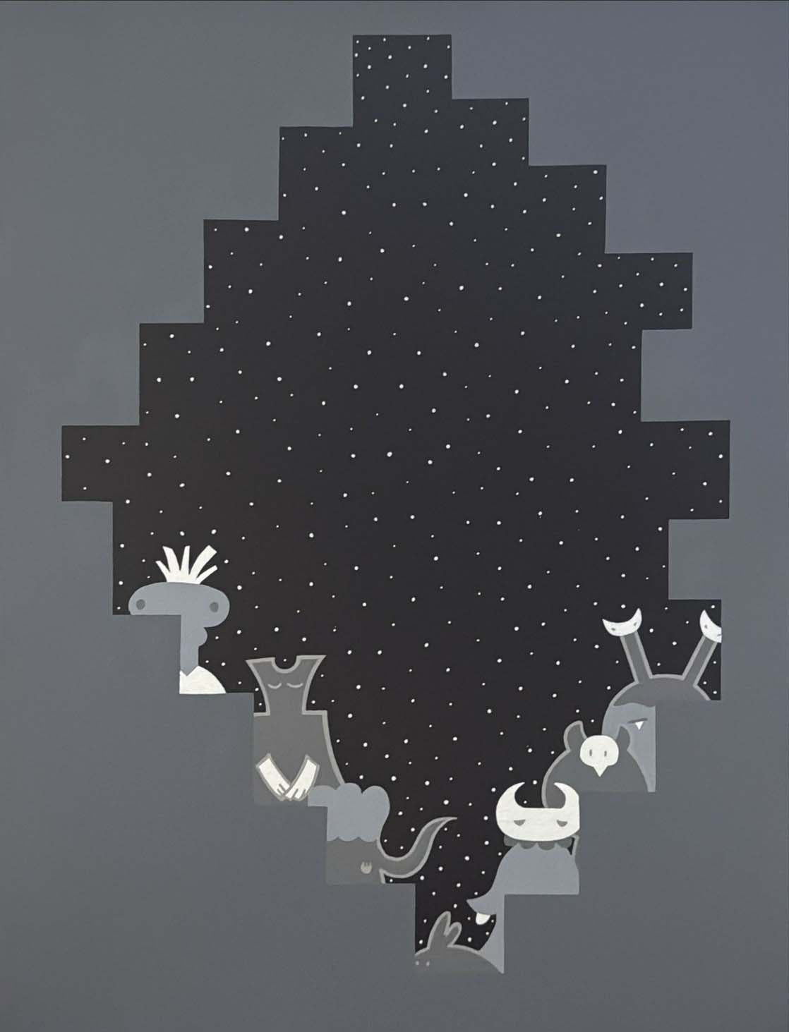 弓指貴弘は、古来より恐れの象徴とされてきた鬼を、ポップなキャラクターとして再構築している。シリーズ《toon demon》や《mirror of the soul》では、情報社会における自我のあり方や、人の内面に潜む不安を静かに映し出す。低明度の色彩と簡潔な構成が生み出す夢幻的な空気には、形なきものへの畏れと日本的な感性が滲む。