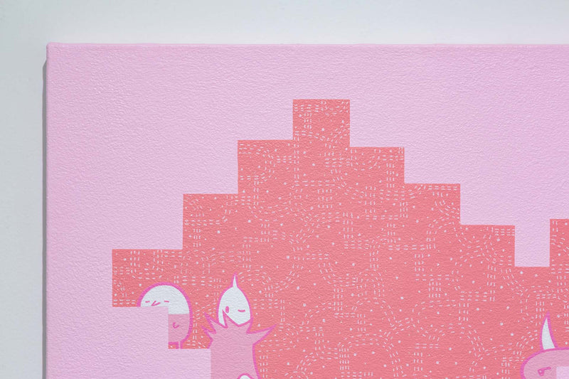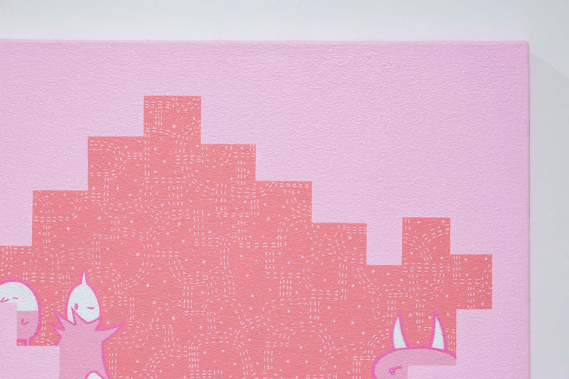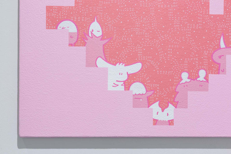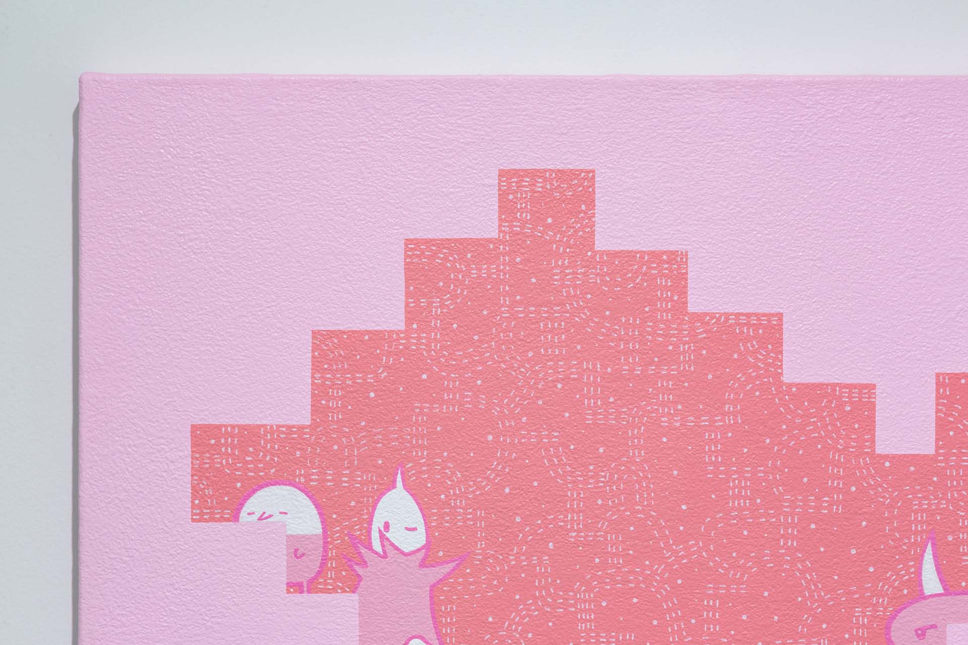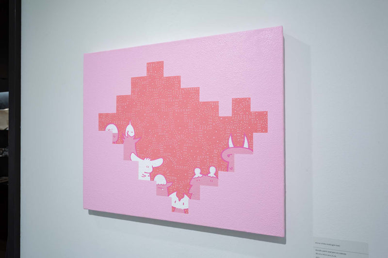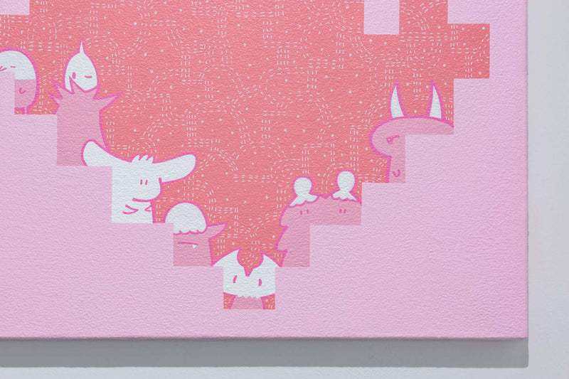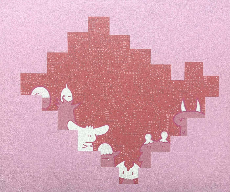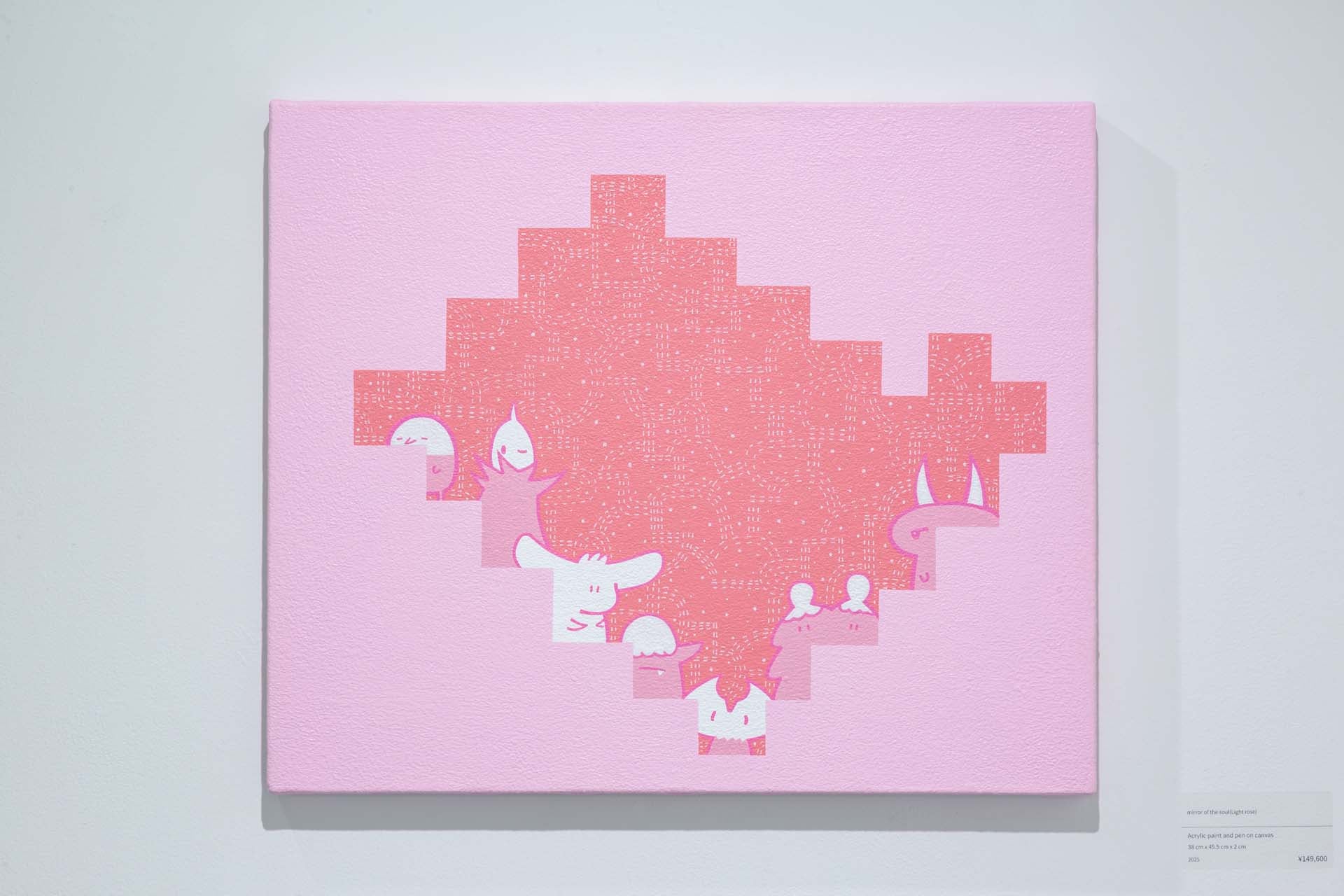 弓指貴弘は、古来より恐れの象徴とされてきた鬼を、ポップなキャラクターとして再構築している。シリーズ《toon demon》や《mirror of the soul》では、情報社会における自我のあり方や、人の内面に潜む不安を静かに映し出す。低明度の色彩と簡潔な構成が生み出す夢幻的な空気には、形なきものへの畏れと日本的な感性が滲む。