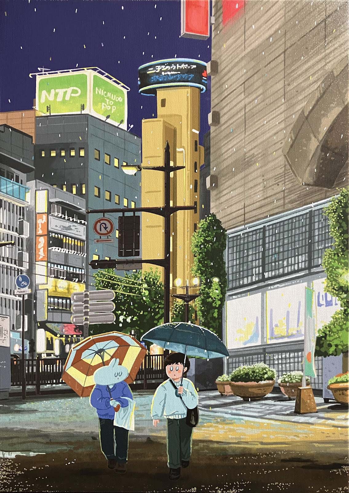 ヨシサコツバサの作品に描かれる風景は、拠点とする鹿児島を思わせながらも、現実には存在しない色彩と空気をまとっている。明確な筆致と鮮やかなトーンで構成される画面には、現実と虚構の境界が曖昧に溶け合う。そこに現れるうさぎは、日常と幻想をつなぐ媒介として、静かに寓話の世界を立ち上げている。