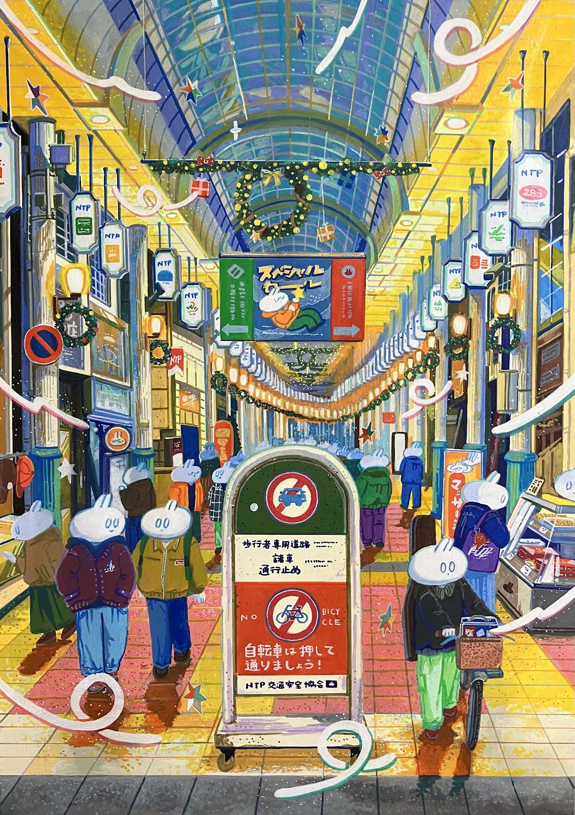 ヨシサコツバサの作品に描かれる風景は、拠点とする鹿児島を思わせながらも、現実には存在しない色彩と空気をまとっている。明確な筆致と鮮やかなトーンで構成される画面には、現実と虚構の境界が曖昧に溶け合う。そこに現れるうさぎは、日常と幻想をつなぐ媒介として、静かに寓話の世界を立ち上げている。