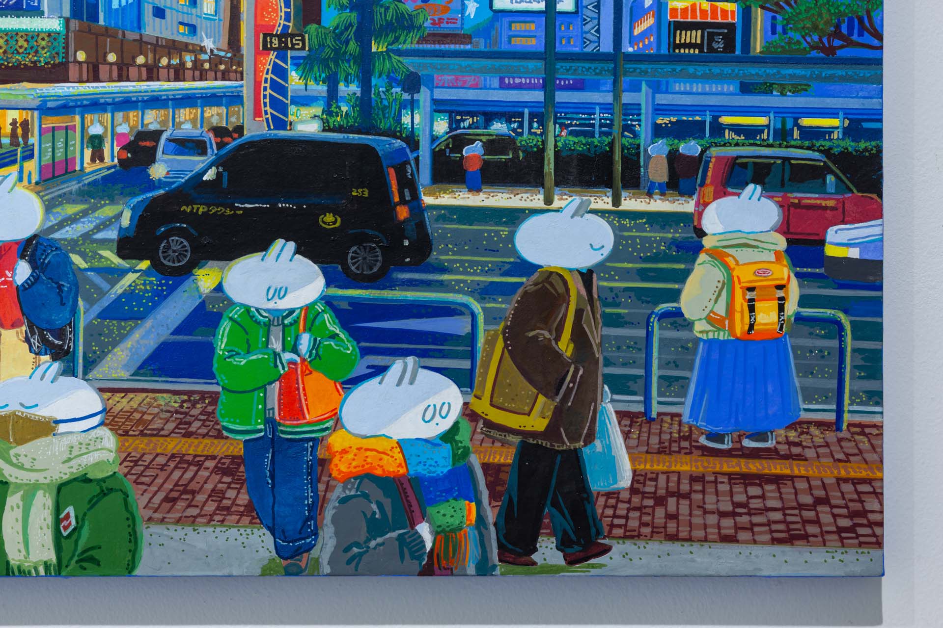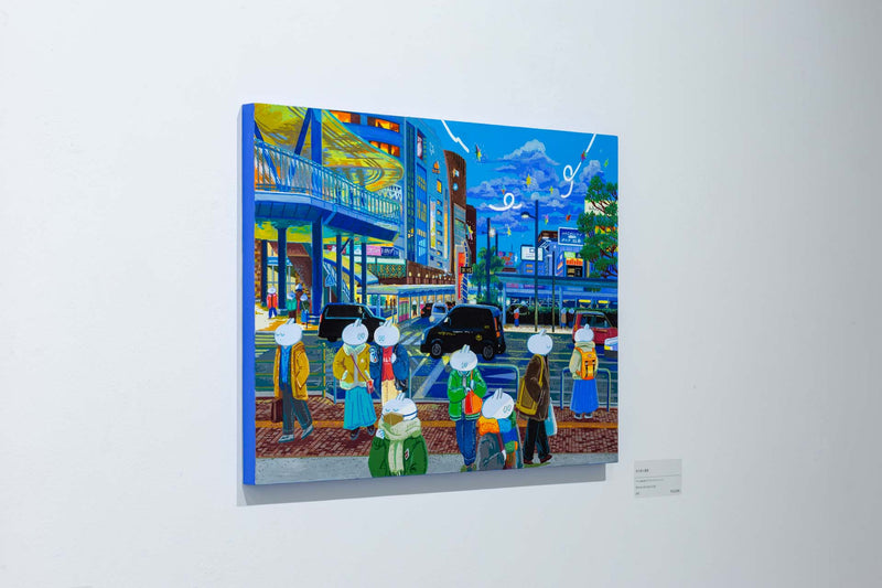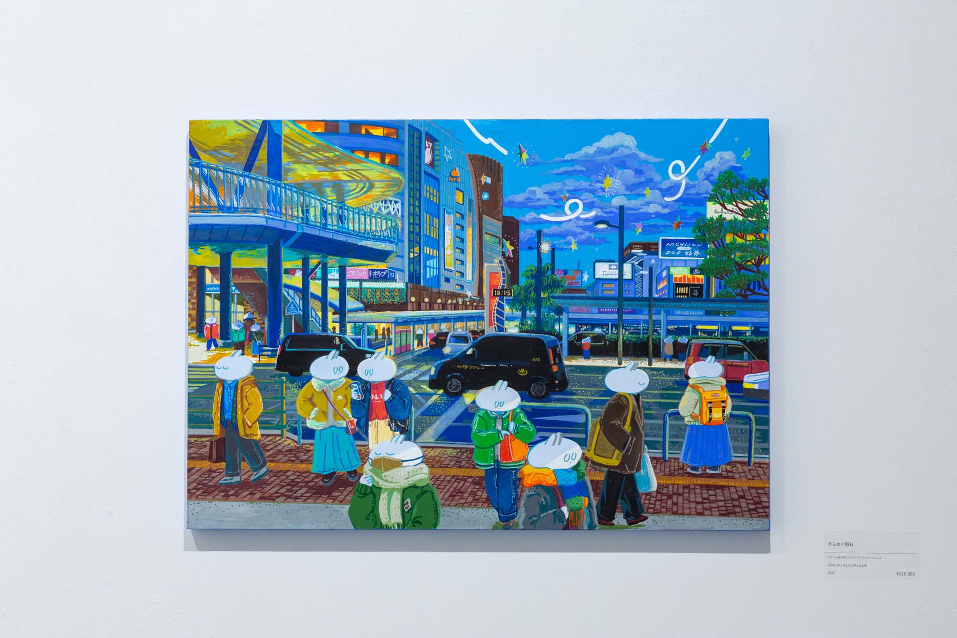 ヨシサコツバサの作品に描かれる風景は、拠点とする鹿児島を思わせながらも、現実には存在しない色彩と空気をまとっている。明確な筆致と鮮やかなトーンで構成される画面には、現実と虚構の境界が曖昧に溶け合う。そこに現れるうさぎは、日常と幻想をつなぐ媒介として、静かに寓話の世界を立ち上げている。