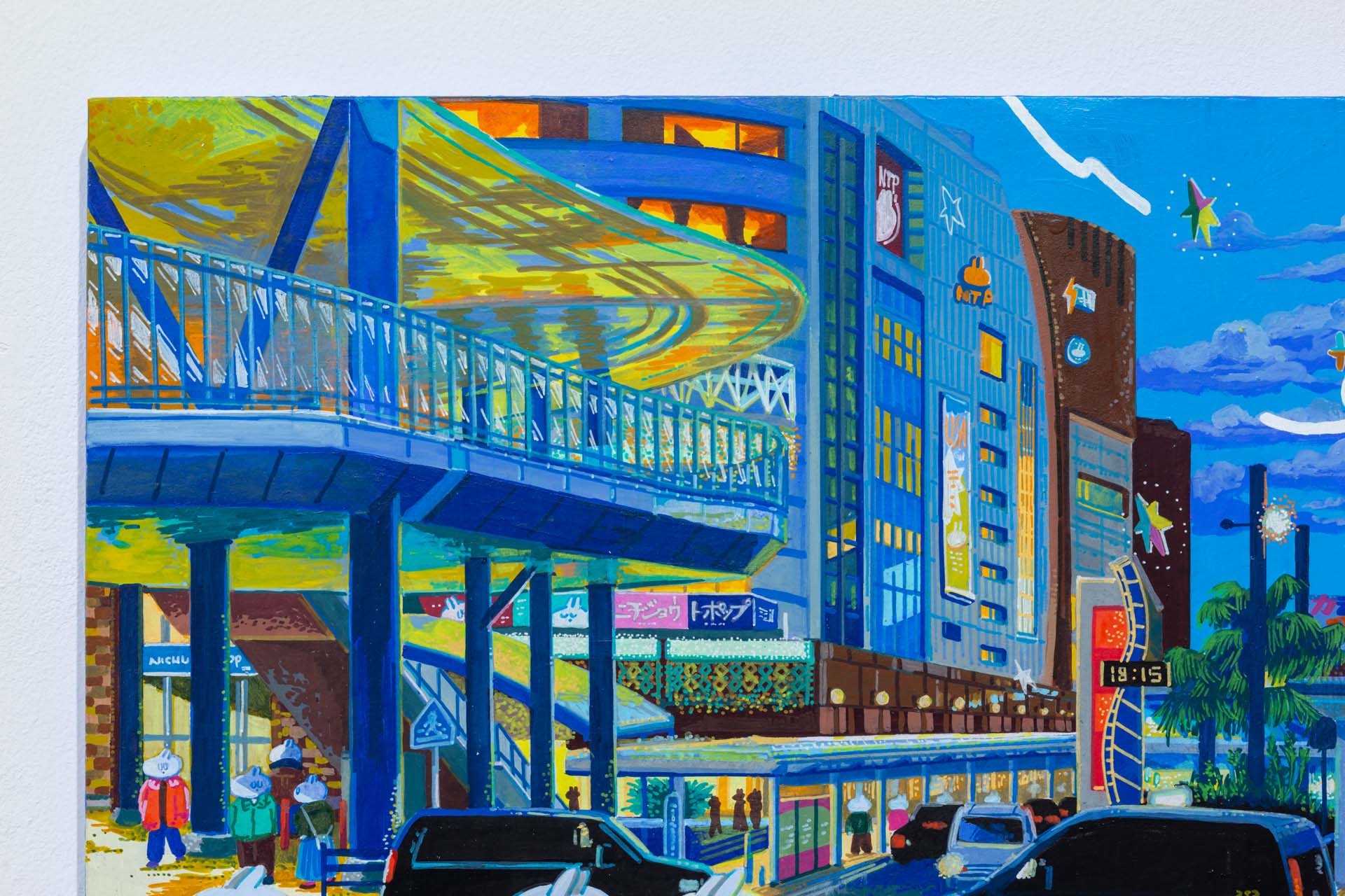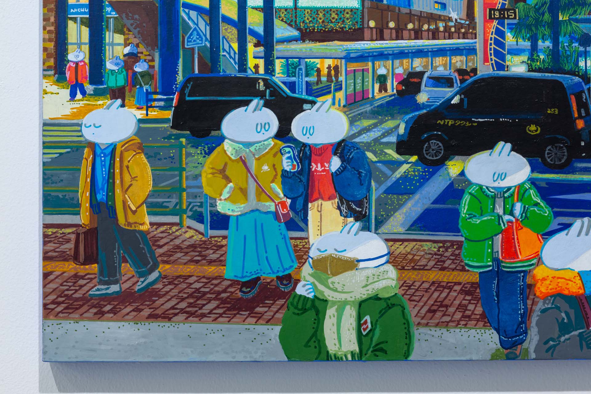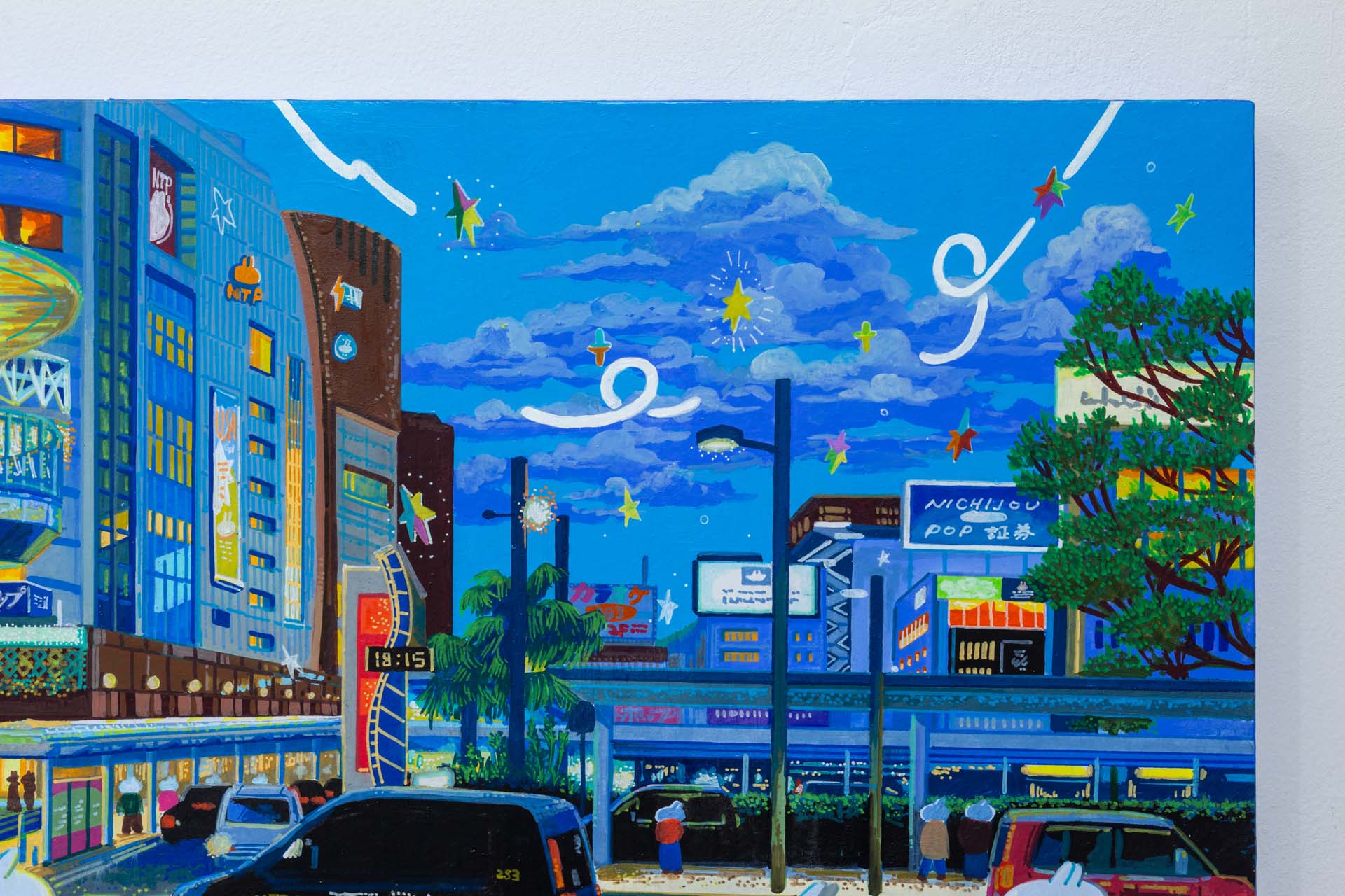 ヨシサコツバサの作品に描かれる風景は、拠点とする鹿児島を思わせながらも、現実には存在しない色彩と空気をまとっている。明確な筆致と鮮やかなトーンで構成される画面には、現実と虚構の境界が曖昧に溶け合う。そこに現れるうさぎは、日常と幻想をつなぐ媒介として、静かに寓話の世界を立ち上げている。