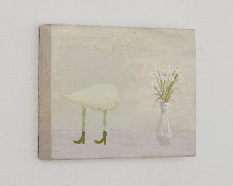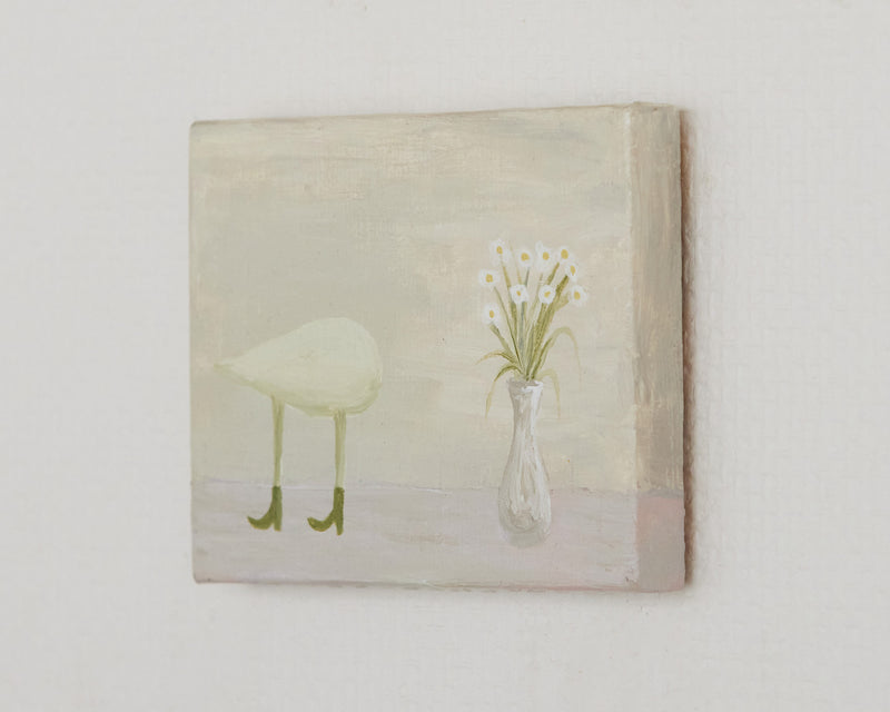 異国の友人から届いた手紙のような感触。そこに描かれるのはシュールな世界。ひとコマ漫画のような具象作品やコラージュによる抽象絵画を描いている秋元。作風を固定するのではなく具象と抽象の間に漂うものを描くことに関心があると話します。テーマに囚われることなく色、形、そしてアクリル絵具など画材のテクスチャーに集中し描いたペインティングとコラージュ作品で構成する「抽象と具象と社長」展示作品。