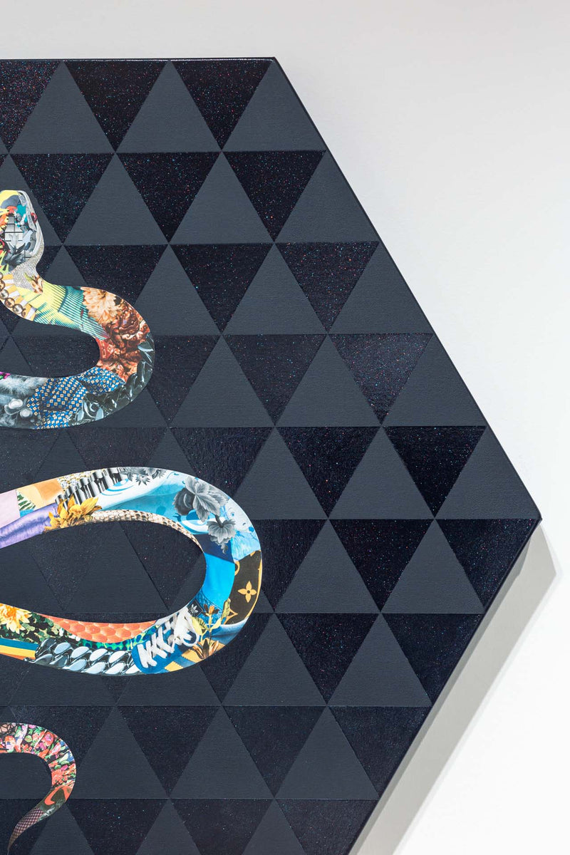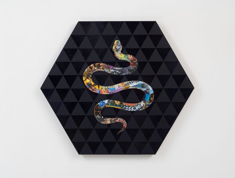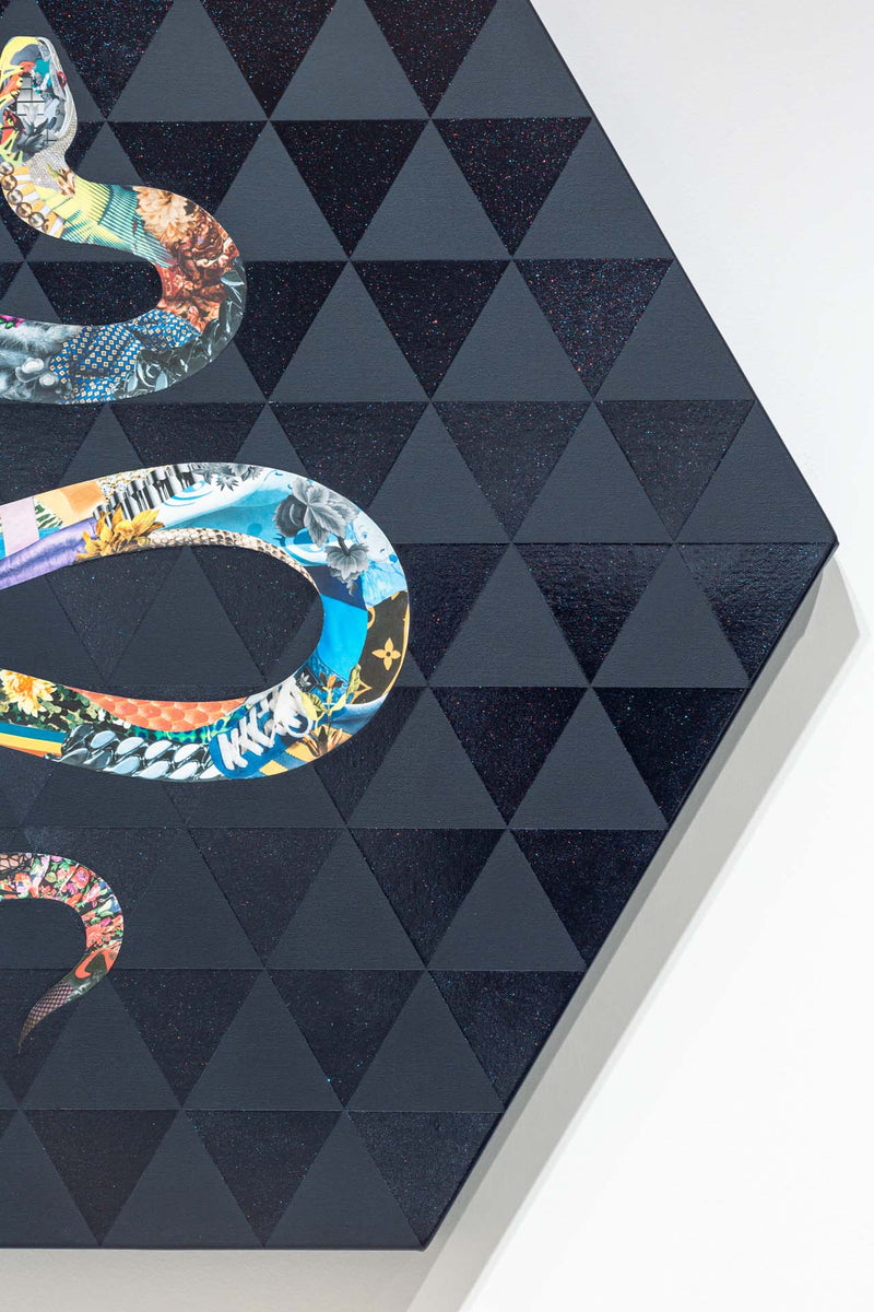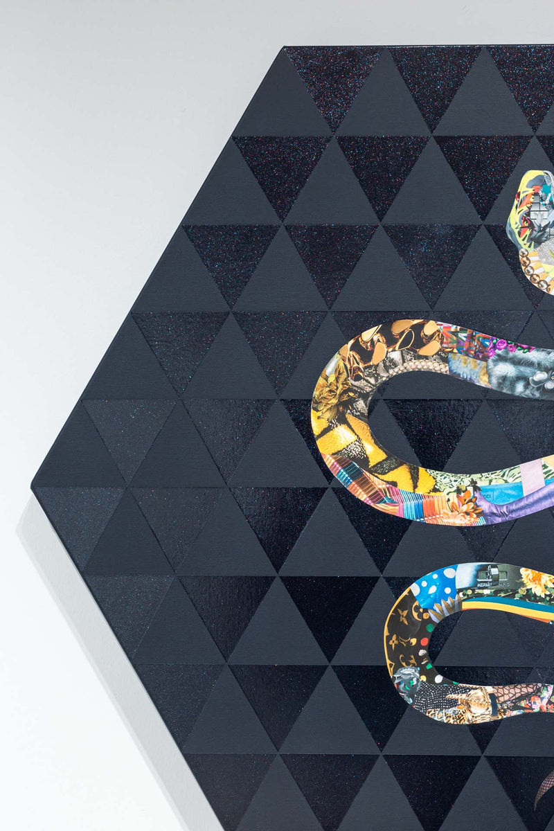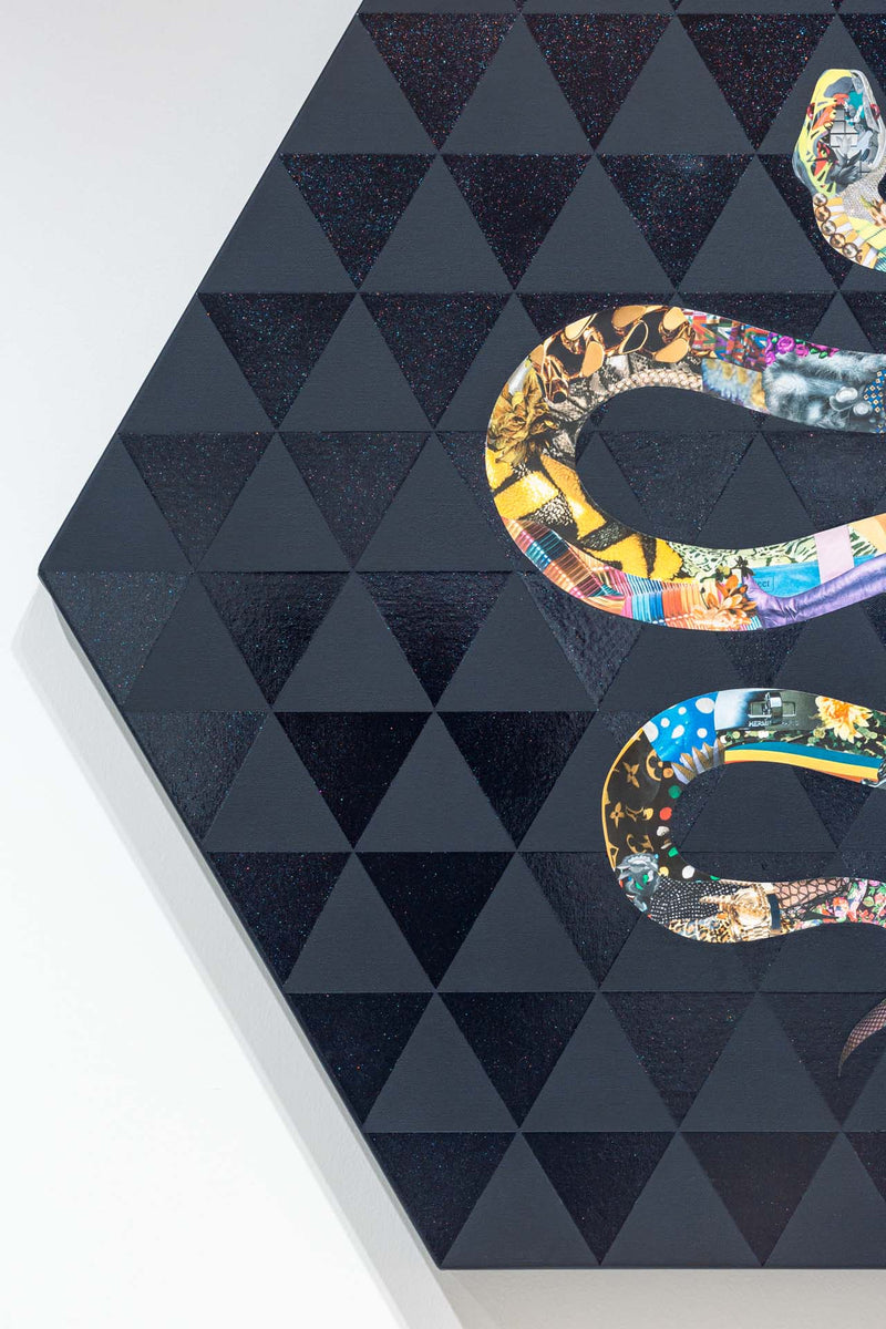 長尾洋 個展「Wild Thought:野生の思考」展示作品。「僕らは未来の先住民」というコンセプトを基に、アフリカ・ナミビアの部族や日本の天狗など世界の伝統的な習俗や儀礼をグラマラスなイメージで浮かび上がらせるコラージュ作品を制作する。