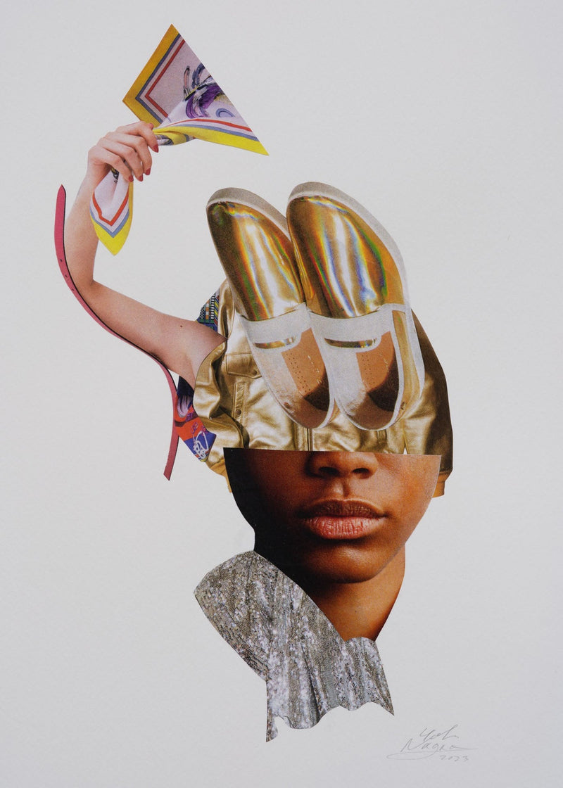 長尾洋 個展「Wild Thought:野生の思考」展示作品。「僕らは未来の先住民」というコンセプトを基に、アフリカ・ナミビアの部族や日本の天狗など世界の伝統的な習俗や儀礼をグラマラスなイメージで浮かび上がらせるコラージュ作品を制作する。